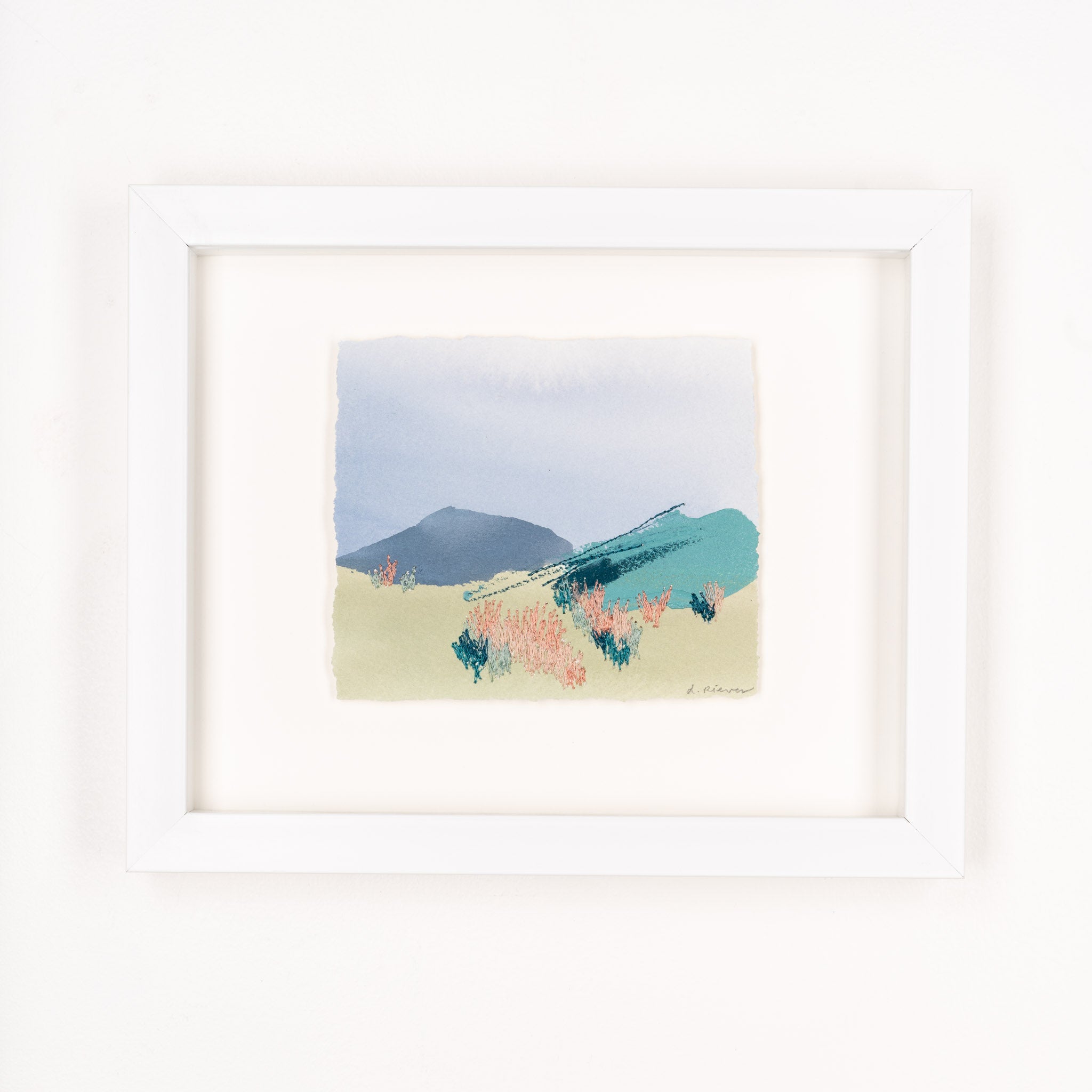 mixed media on paper, floating on white mat, in white shadowbox frame