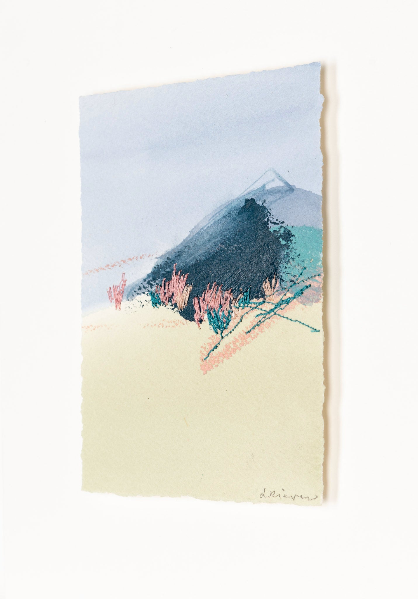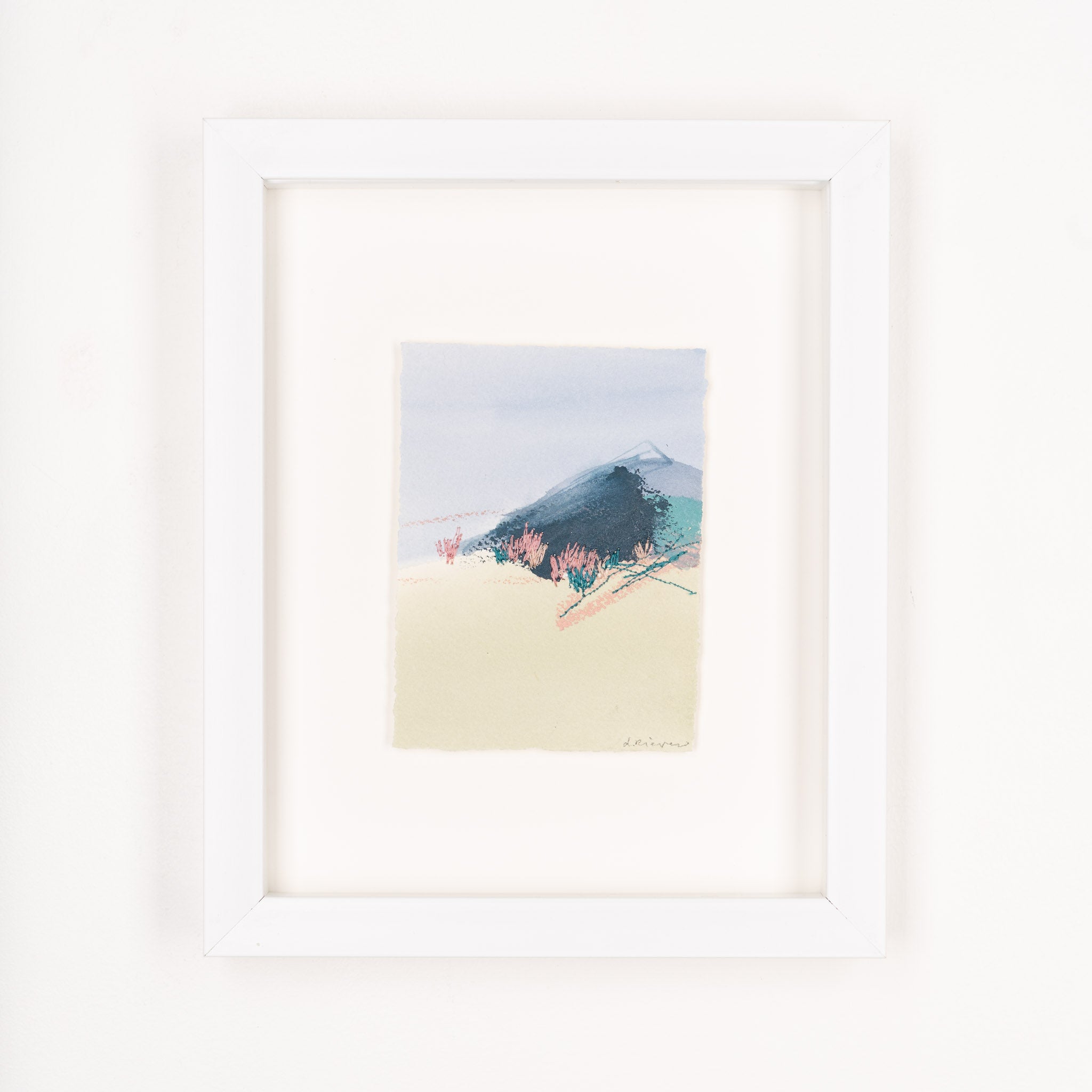 mixed media on paper, floating on white mat, in white shadowbox frame