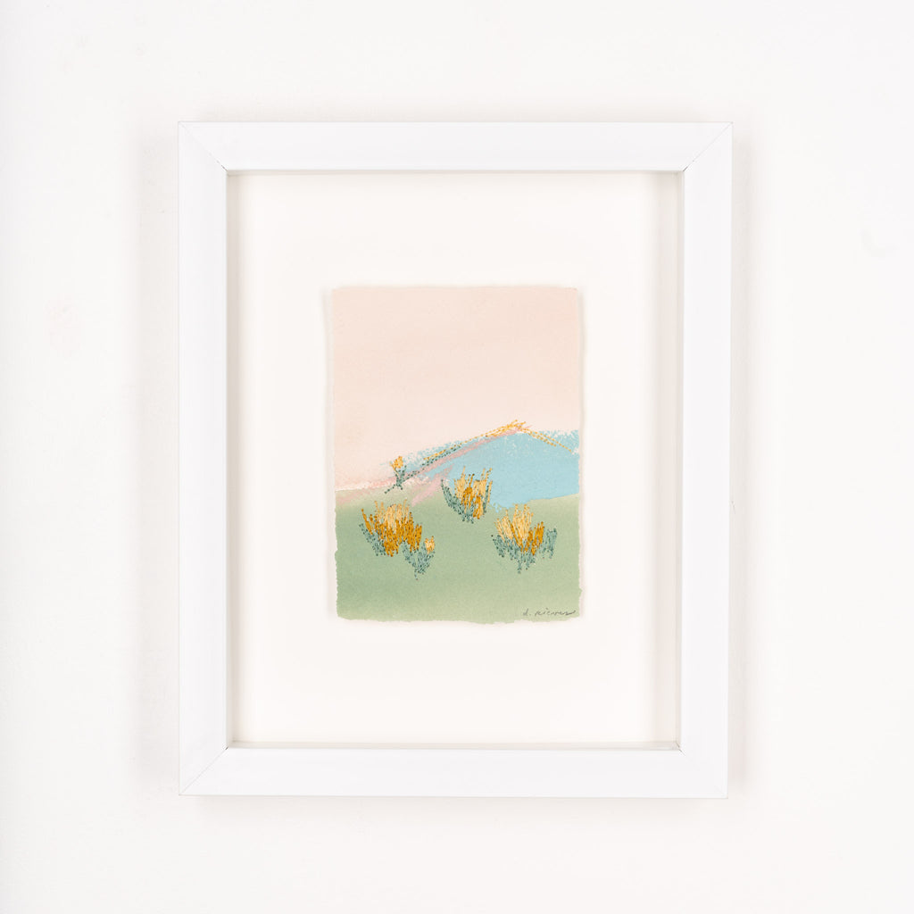 mixed media on paper, floating on white mat, in white shadowbox frame