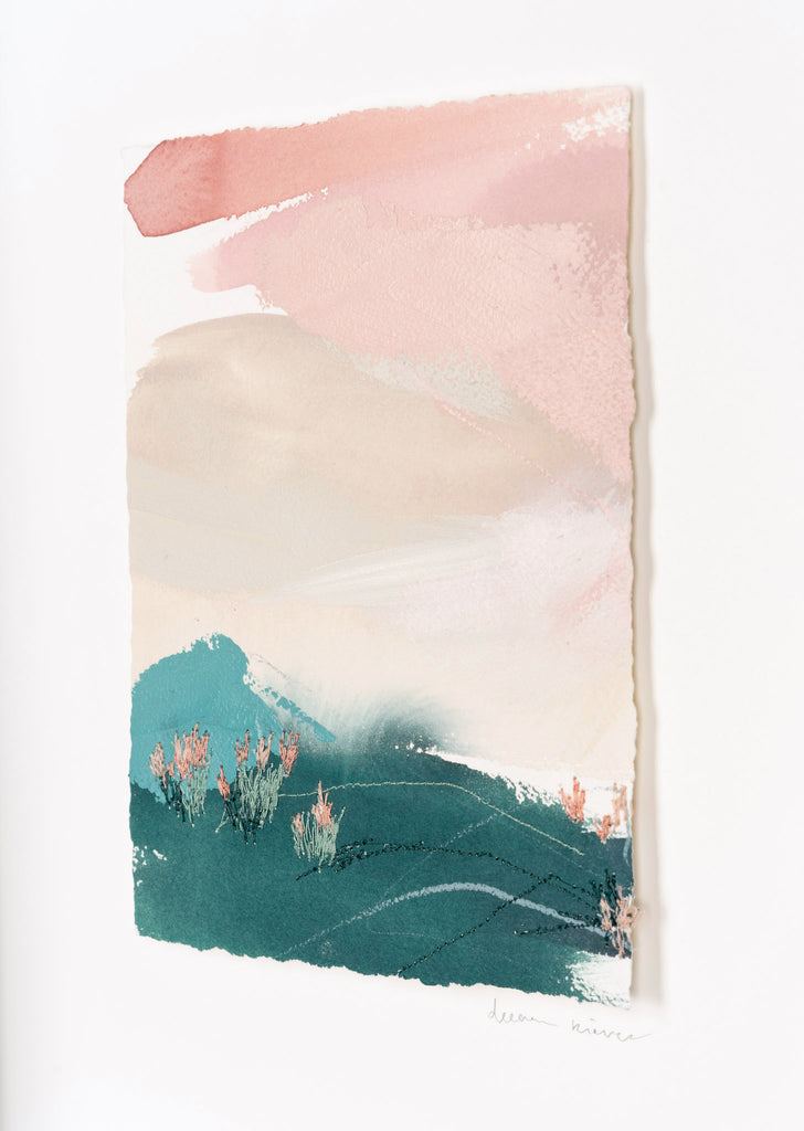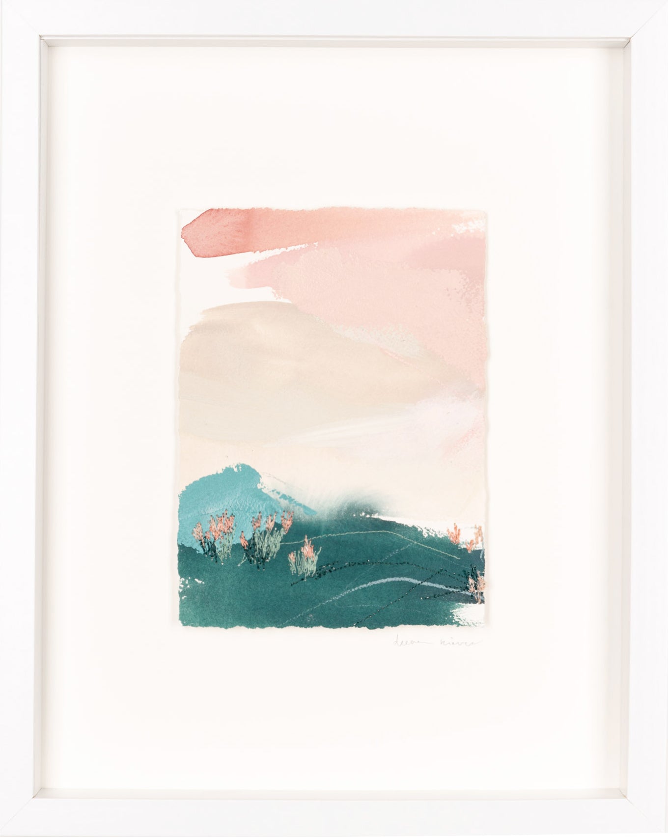 mixed media on paper, floating on white mat, in white shadowbox frame