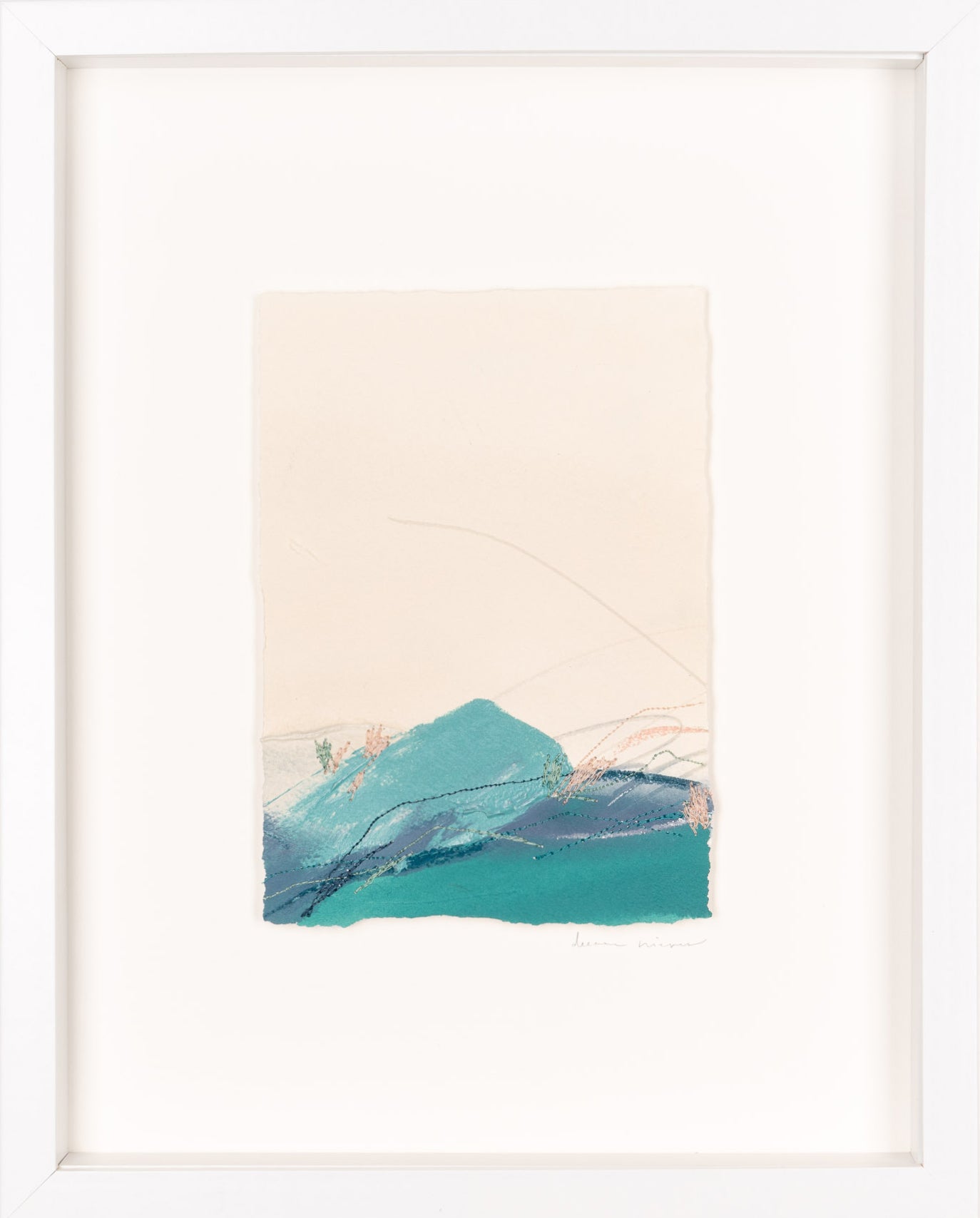 mixed media on paper, floating on white mat, in white shadowbox frame