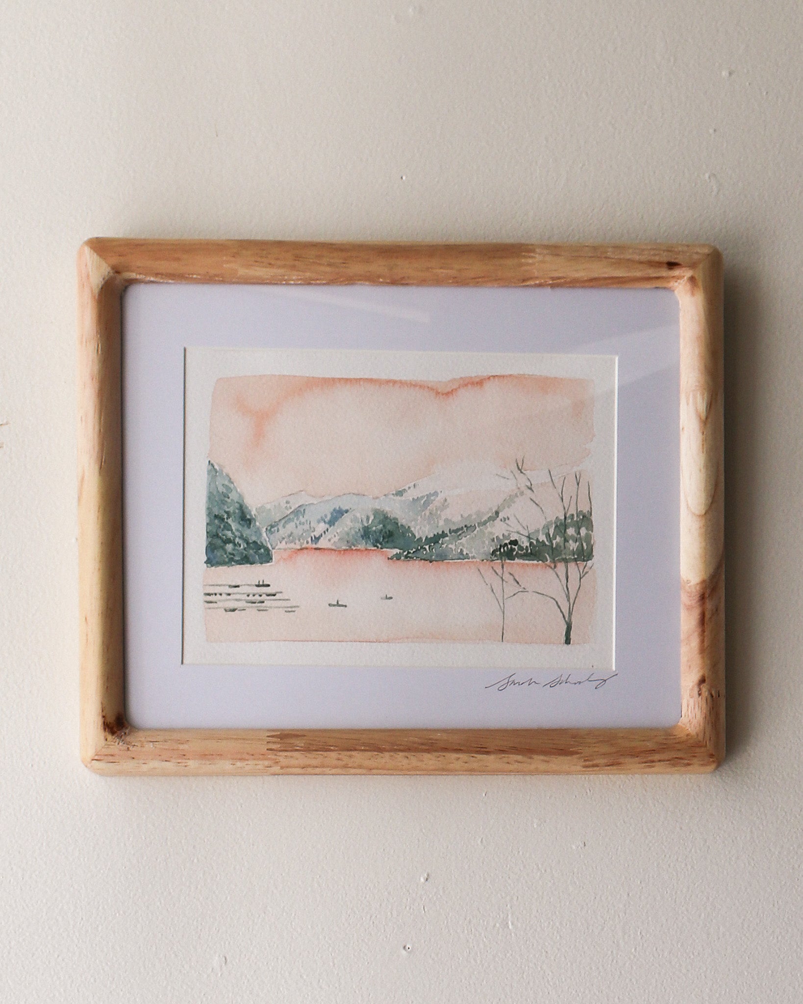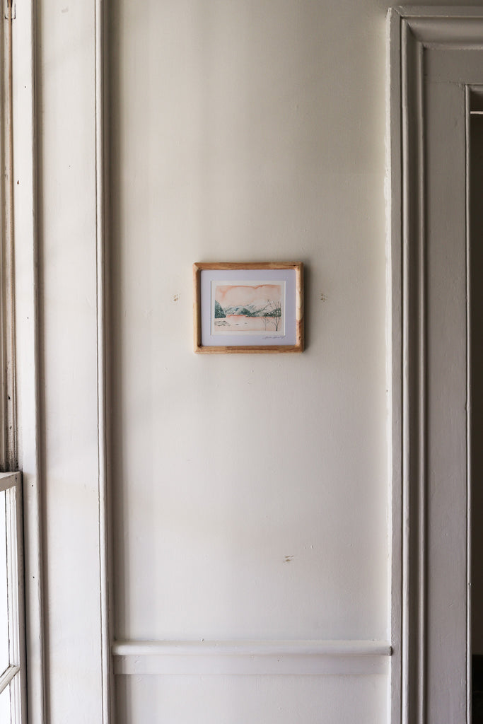 watercolor on paper, in white mat and natural wood frame with rounded corners