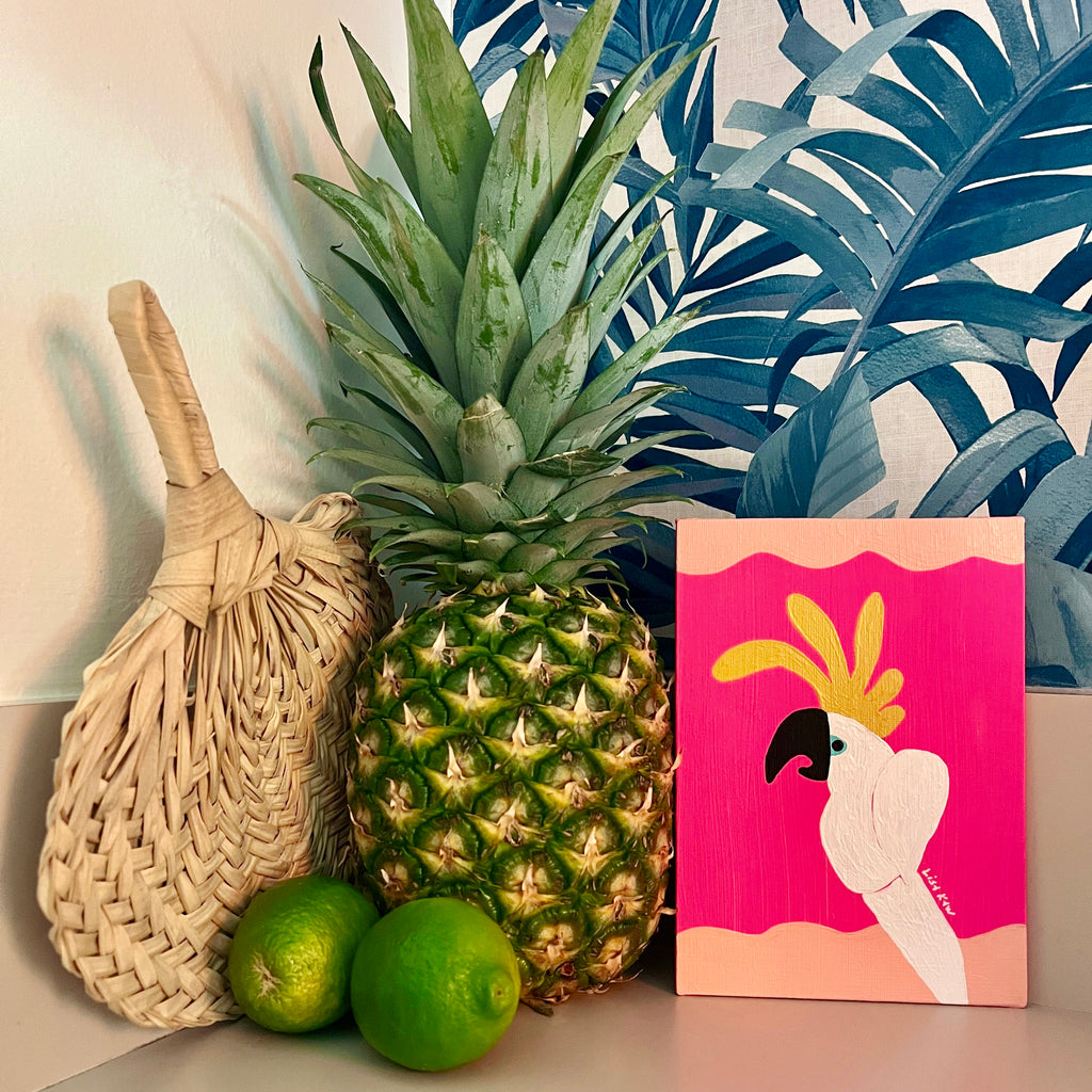 Totally tropical Lisa Kaw shares her love for nature and travel through her vibrant paintings. From her South Florida jungalow, she uses acrylic on canvas to transform the beauty around her into tangible one of a kind treasures. A minimalist at heart, Lisa thrives best when surrounded only by the blues and greens of the natural world and the curious melody of the rainforest chatter. Bali and the Big Island of Hawaii are her most sacred visited places. With a playful palette and a joyful spirit, Lisa Kaw creates work that simply and purely communicates the wonder of our natural world.