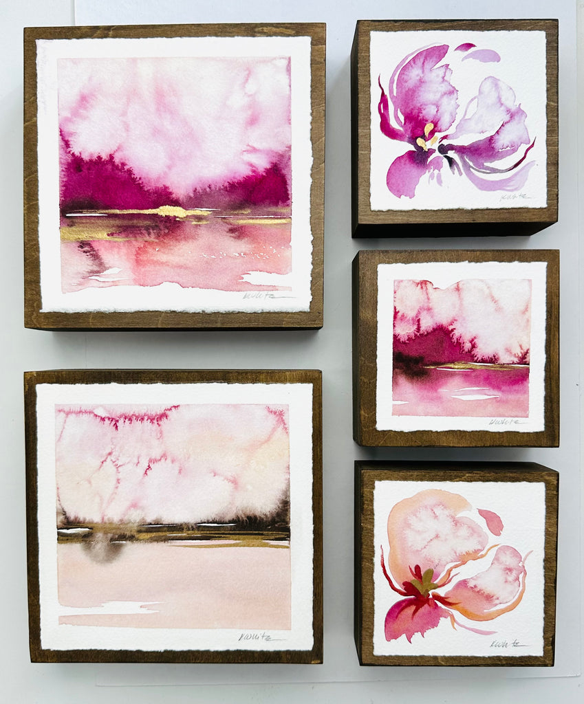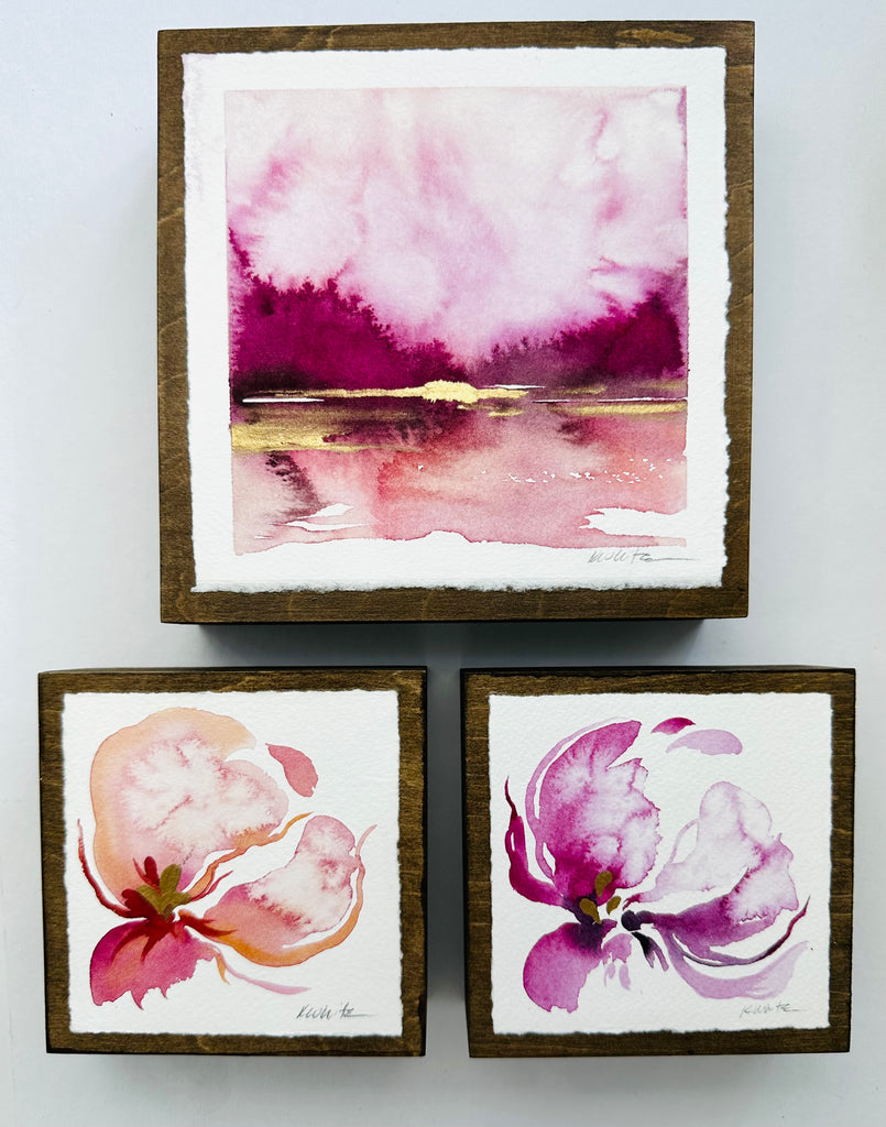 My art is heavily inspired by nature. Each creation takes on its own life, much like nature does when it unfolds. Many of my pieces greet you with a soft, serene atmosphere evoking a peaceful emotion, while others pull you in with the bold colors, telling their own story. I am drawn to the horizon line, the space where land or water meet the sky, a quiet pause at the end of the day as the sun sets, a deep exhale, or a place to root yourself to the earth. It reminds me of how important it is to stay grounded in the world we live in today.​ I received my BFA in Illustration from Washington University in St. Louis. I taught elementary art for many years and have been a professional artist for the past 5 years. In addition to my studio practice, I lead watercolor workshops and retreats. This work allows me to connect with women, teaching them how to use the medium as a tool to ease anxiety. My painting practice is what grounds me daily. I love sharing with others how to set intentions and being mindful with their own creativity.