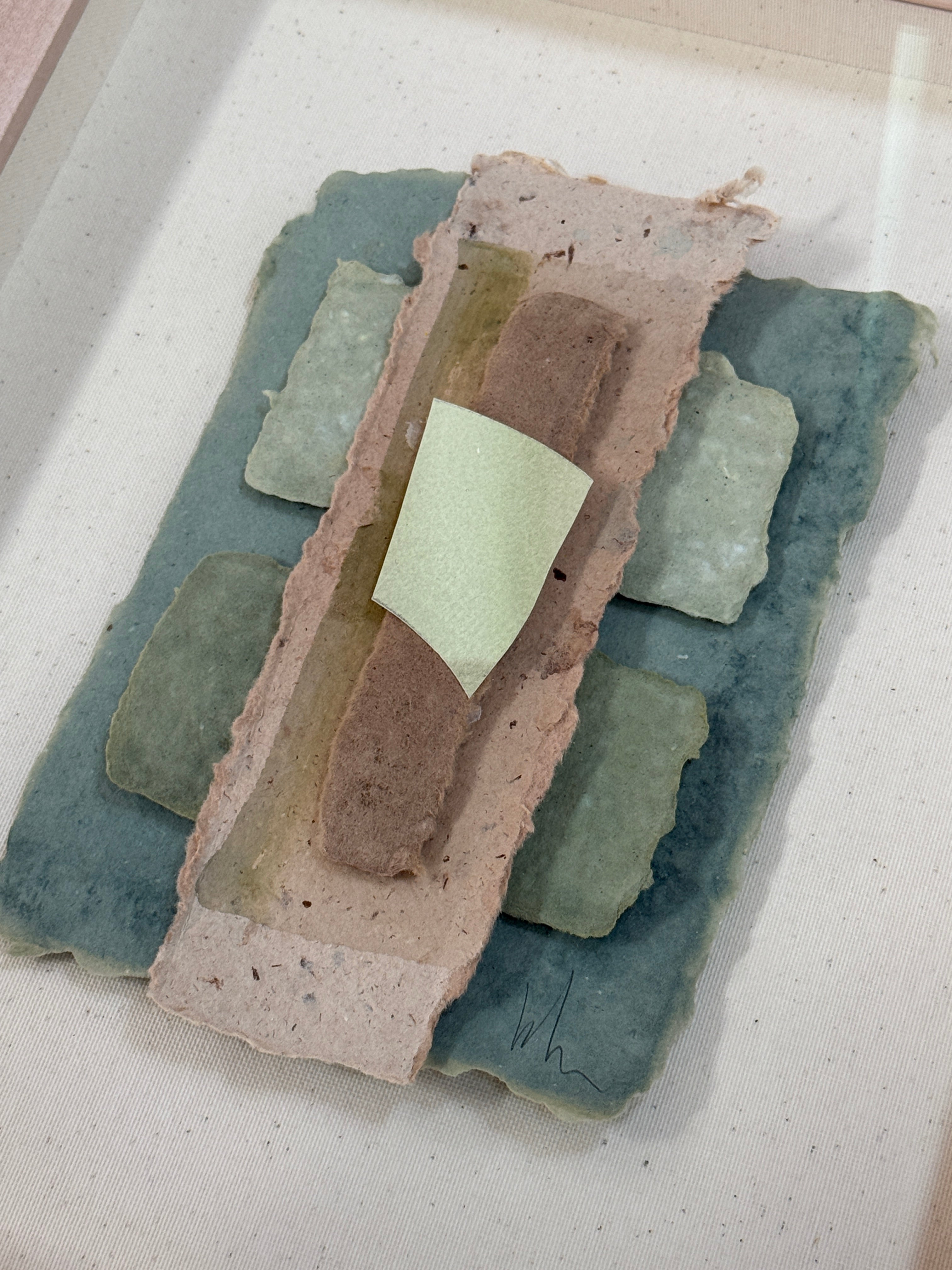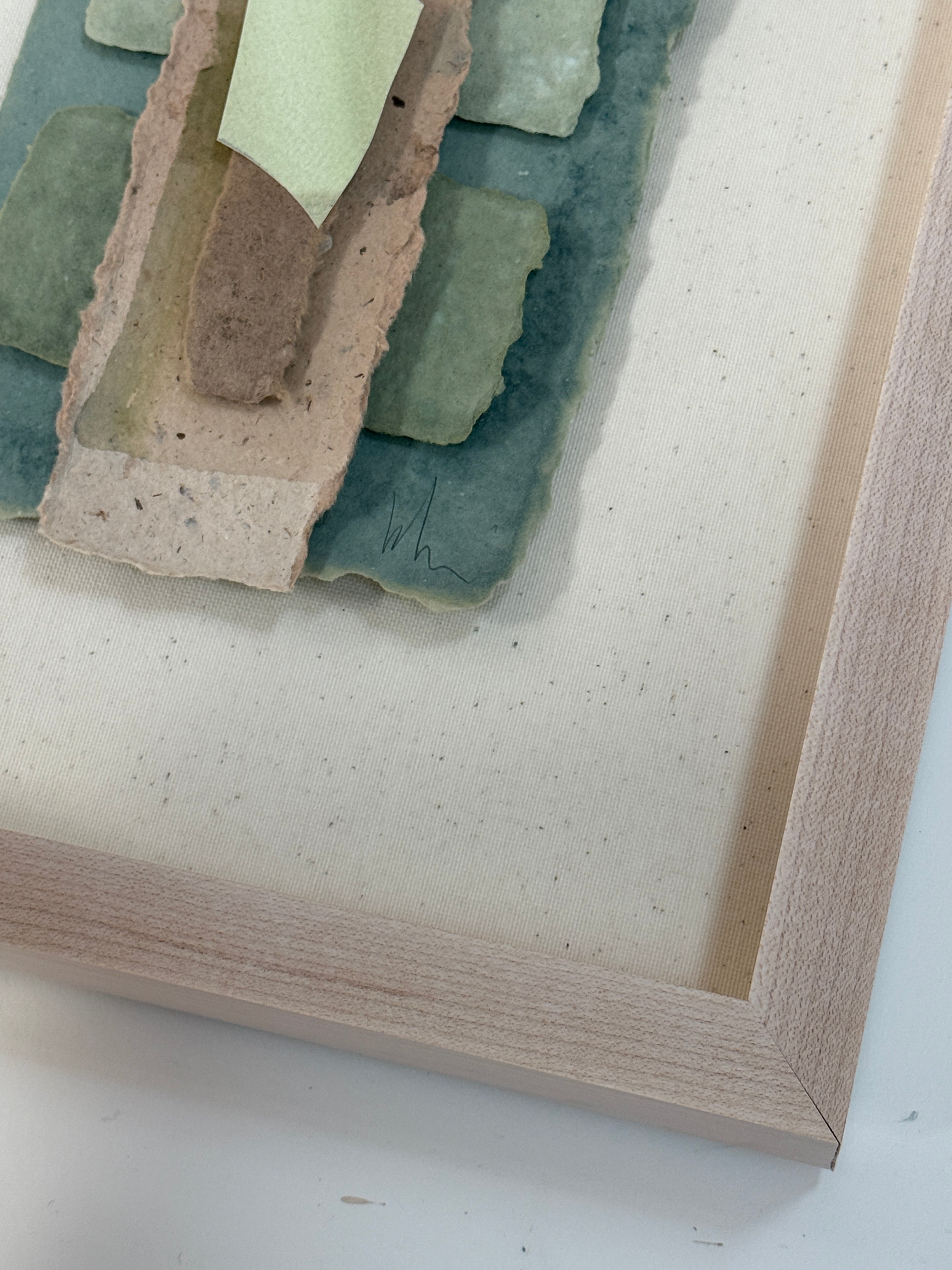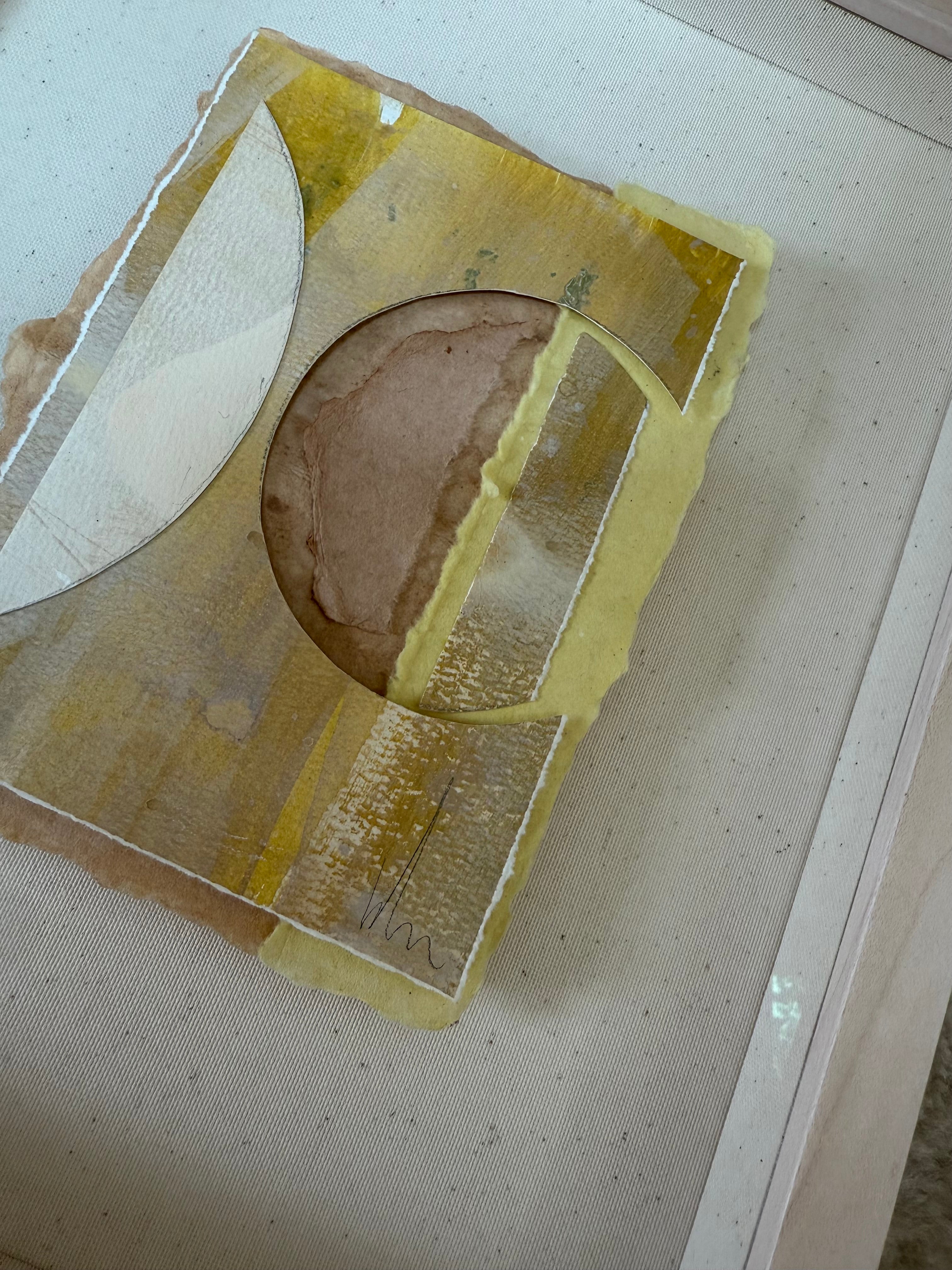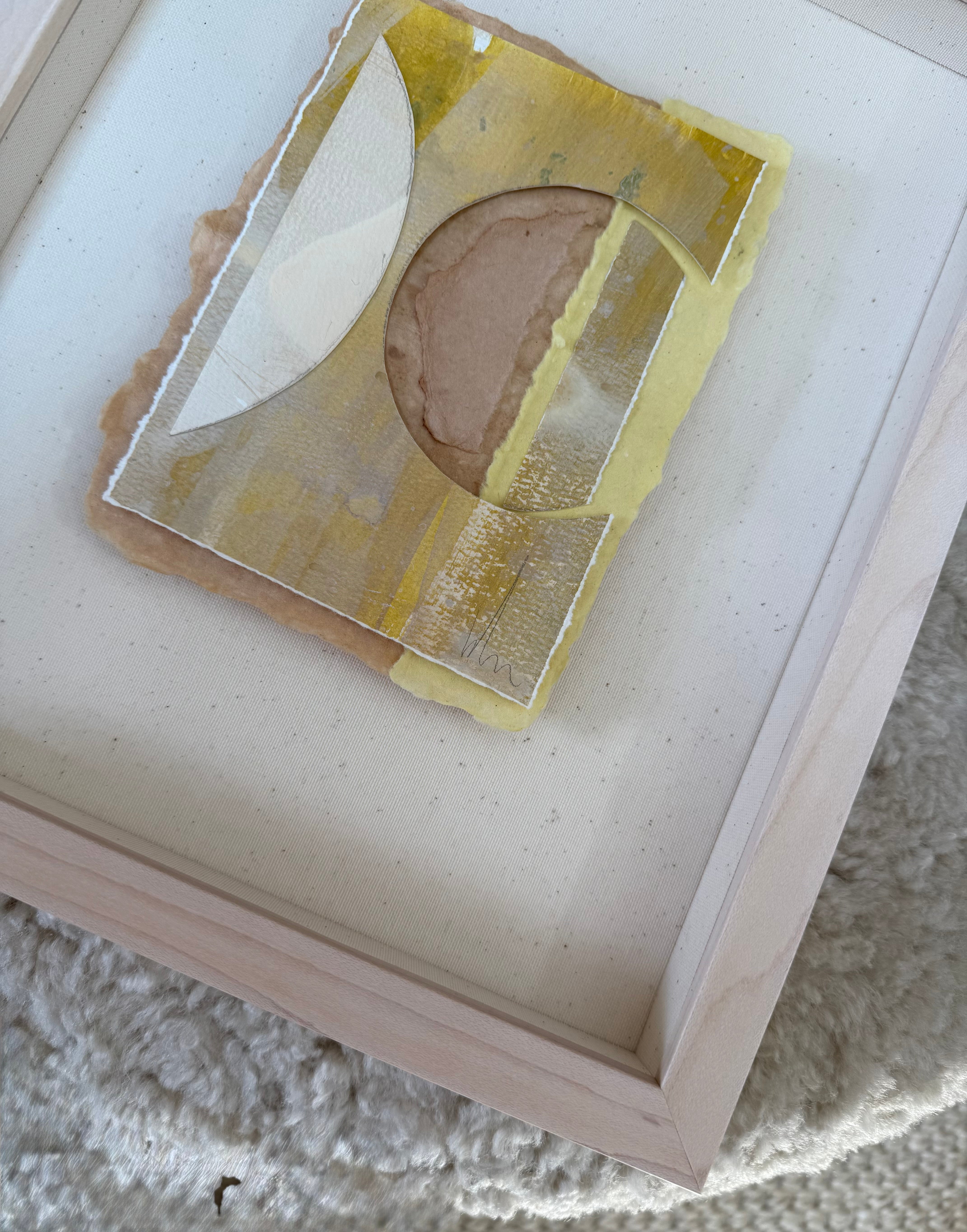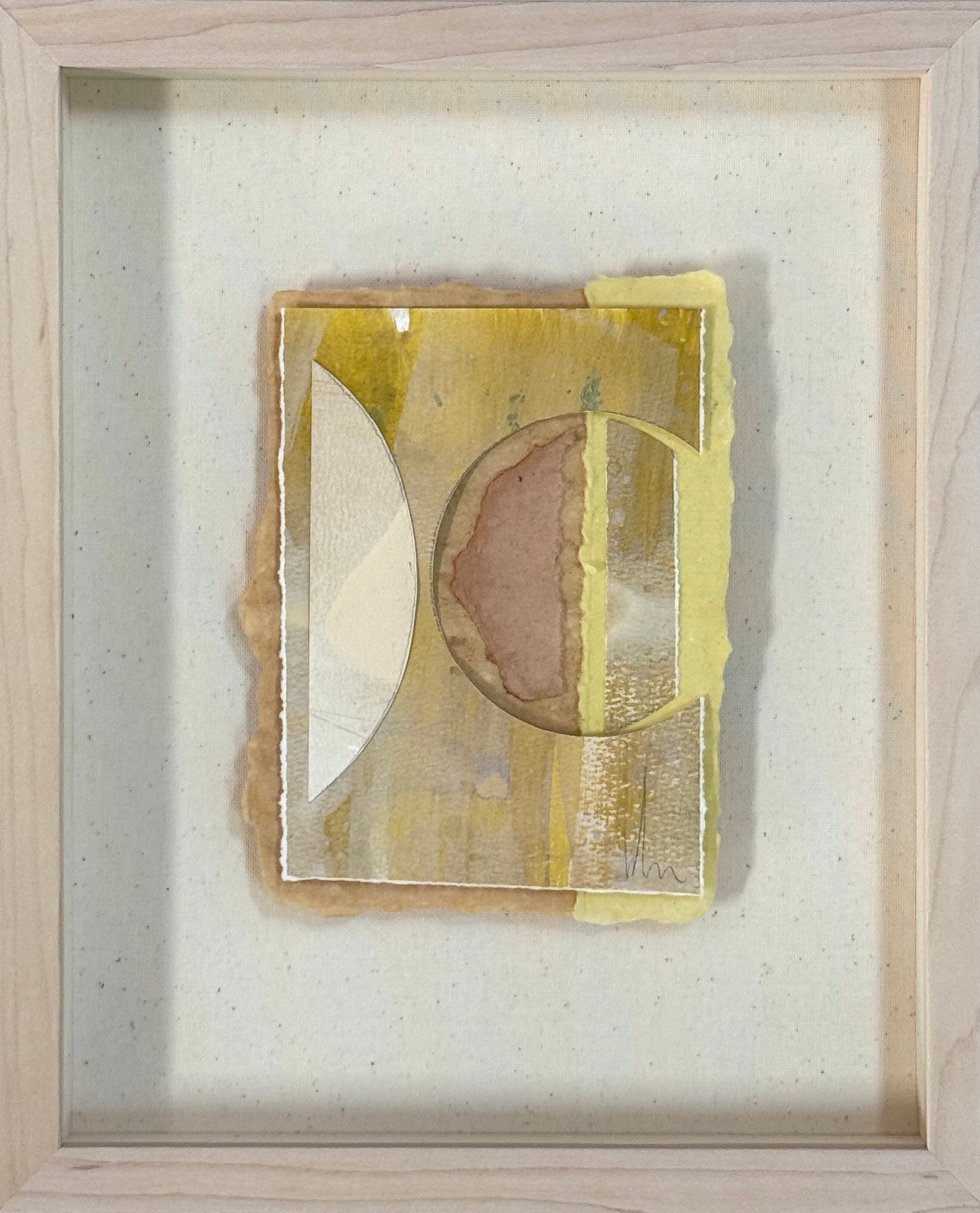 mixed media collage floating on linen, in custom maple shadowbox frame