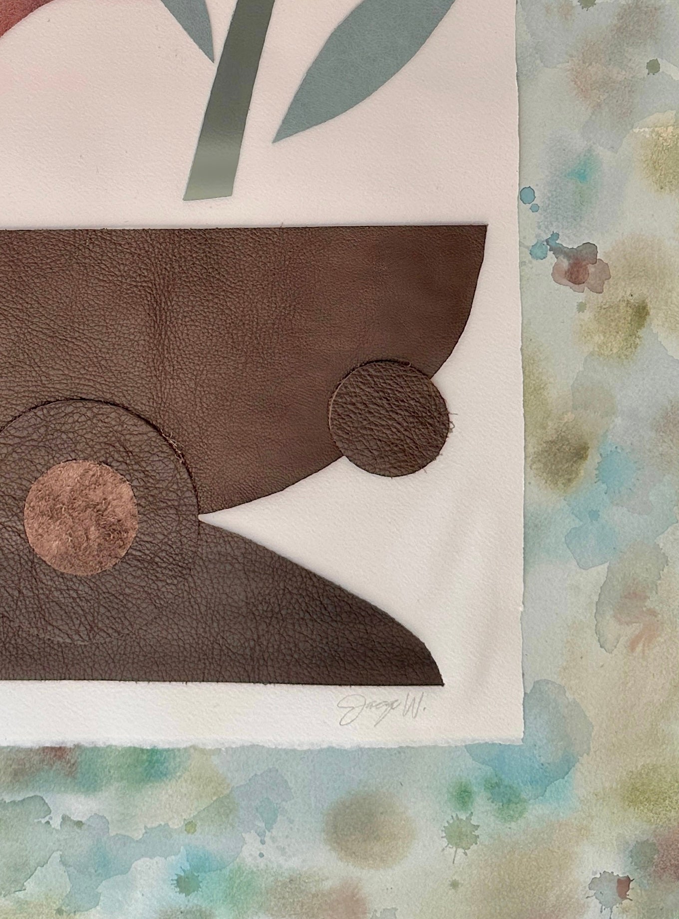 My passion as an artist comes from a life-long desire to create. Growing up with a parent in the military, I was consistently moving around from one place to the next, all the while collecting shapes, places and colors to put in my back pocket and one day use. I was always a painter but started to expand my idea of what could and couldn't be used as art in high school and continued until I finally found my material of choice while in college doing a project made of scrap textiles, including leather and other recycled materials. Years later, in 2018, I started my embarkment as an artist experimenting with different mediums and textiles that slowly evolved into my primary use of leather today. Currently, I live in Memphis, Tennessee with my husband, Alan, and our child, Arrison. When I'm not in the studio, we are often found enjoying local parks, taking nature walks led by our little one. Inspired by the landscapes I grew up seeing and my travels, I soak in my surroundings and then illustrate them in my own way through collages. I am always mesmerized with the way the calming colors and soft layered textures of my pieces can speak to others without using words. A little leather on a wooden panel creates a shared experience between you, the viewer, and me, the artist. This connection brings me such joy and compels me to create the way I see the world: full of color and unsuspecting textures.