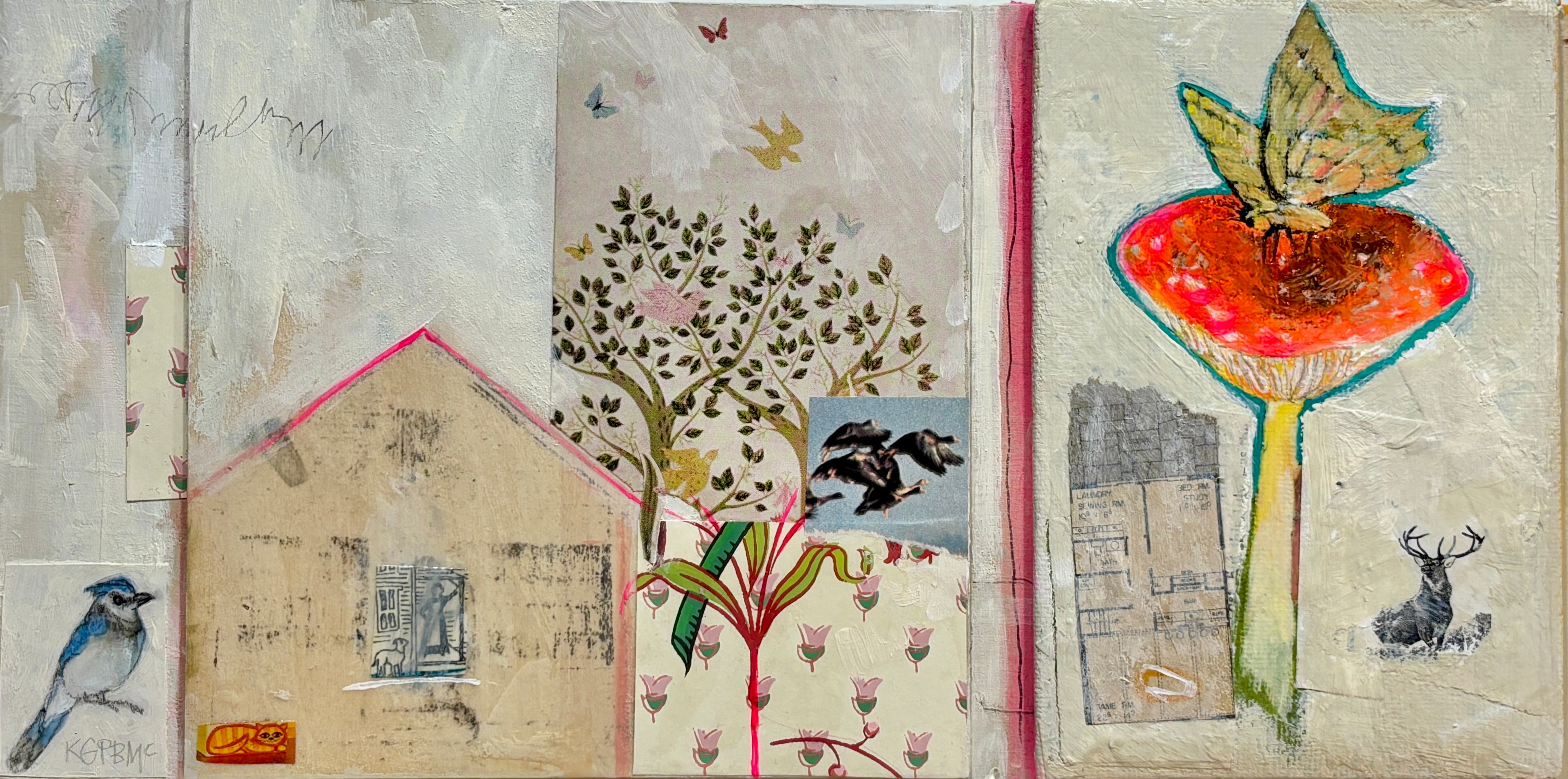 A lifelong artist, I make art because coming up with an idea is what gets me out of bed in the morning and into my studio, mercifully located in my home. So much of what I love in life is at home- my pets inside and wildlife out, nature pouring through the windows, comfortably cluttered rooms full of books and art, the forest surrounding me. My art originates with that early morning idea, a daily walk in the woods, the imagery around me. The deep connection to my surroundings is reflected in the art I make, even using pages of books in my art and the book itself as the canvas with the animals love as the subject. Animal and landscape renderings in mixed media, storytelling dioramas and large works on canvas all have a similar feel of natural wonder.