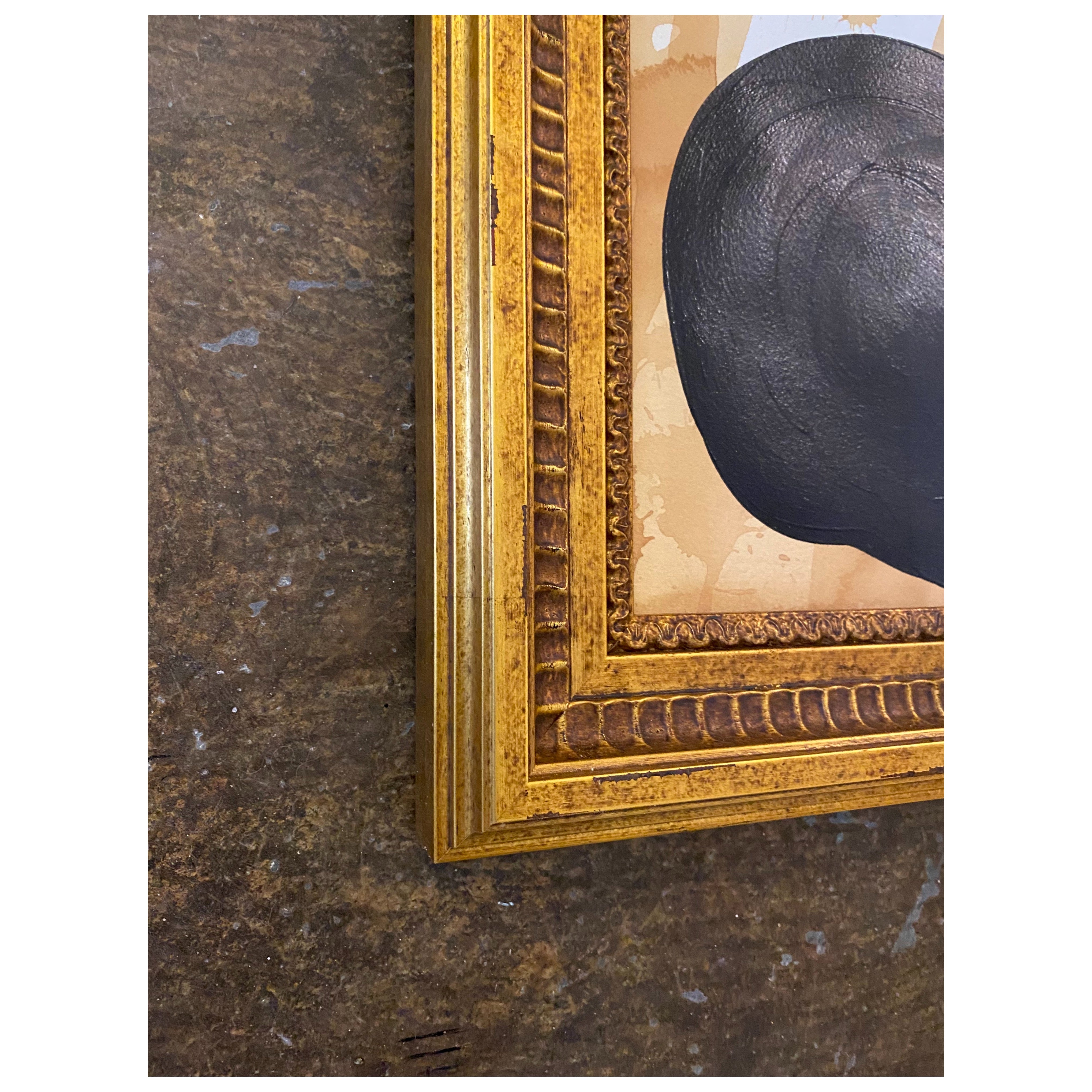 acrylic on tea stained paper, in ornate gold frame with museum glass