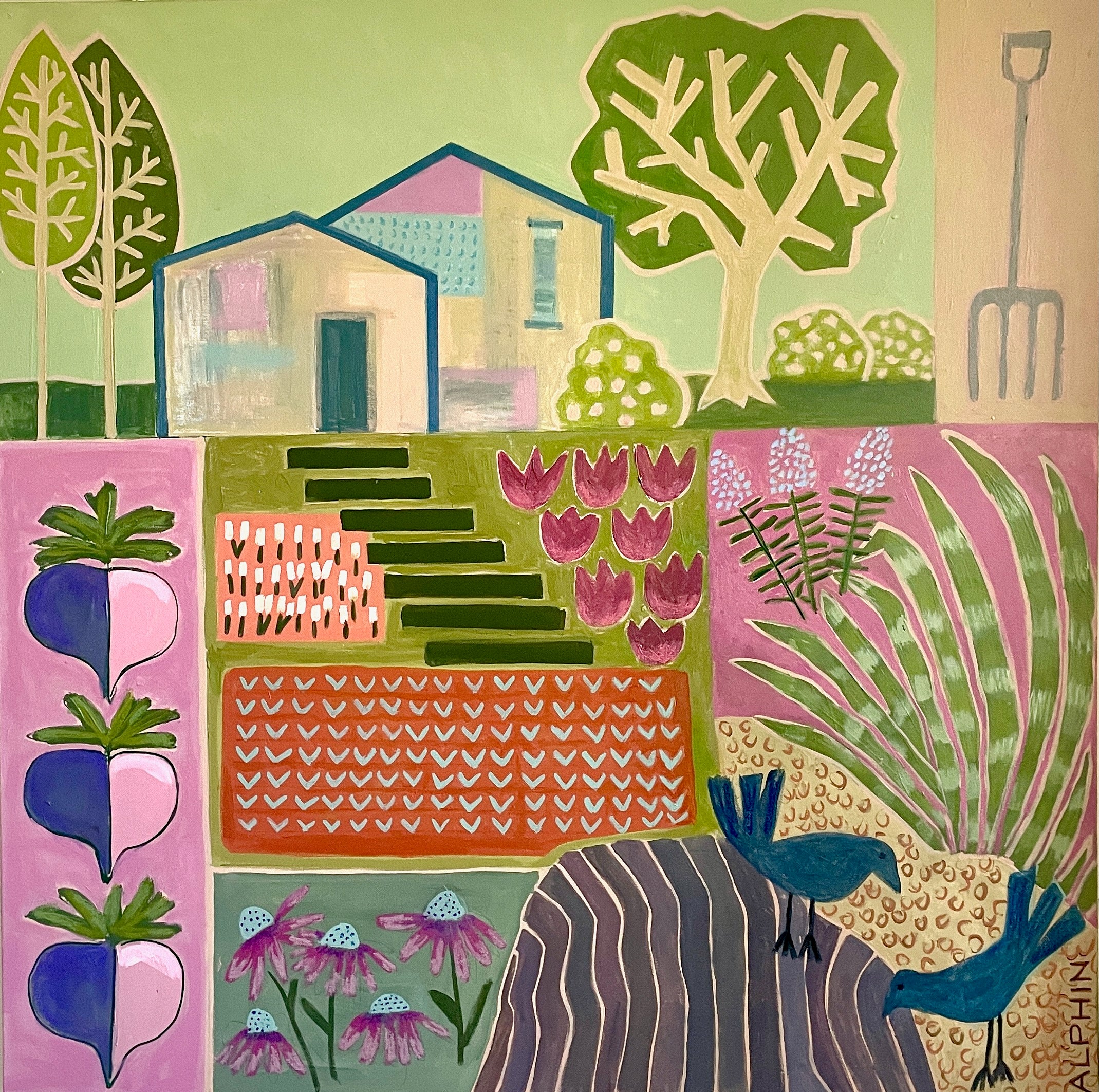 Debby Alphin grew up in Charlotte and graduated from the University of North Carolina at Chapel Hill, working first in advertising and later in software design. In 2003 after raising a family, she decided to pursue a second degree in architecture and began taking drawing and painting classes in order to create an entrance portfolio. The art won out and she began painting full time. She works in both oils and acrylics and describes her abstracts as a way to create order out of chaos. She has been fortunate to study with Elizabeth Ross, Andy Braitman, Nancy Franke, Jeanette LeGrue, David Shevlino, Gary Weiss and Gary Bodner. The California abstract artist, Nicholas Wilton, has been an incredible teacher and mentor. Artist Statement: “While architecture, geometry, symbols, and anything black and white have always inspired me, they are becoming much more apparent in my art. I like a certain amount of structure as I feel it grounds my work. From there I intuitively reference my own vocabulary of icons, both real and invented to create a narrative. I gravitate to straight lines, graphic shapes, lost edges and unique mark making to create a visual story which in the end I hope is as entertaining and appealing to the viewer as it is me, the artist. The joy is in the process.”
