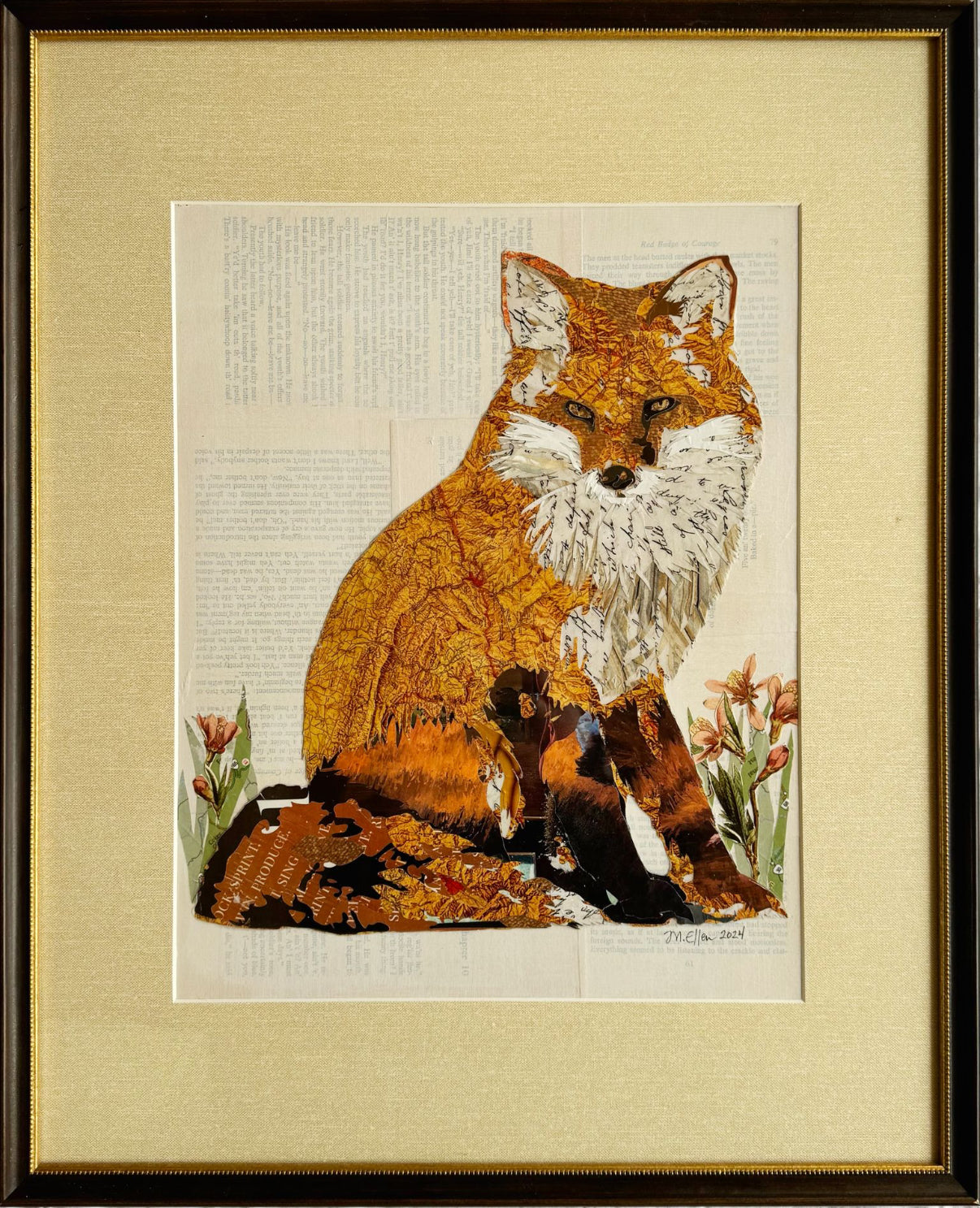 mixed media on panel, framed in black and gold wooden frame