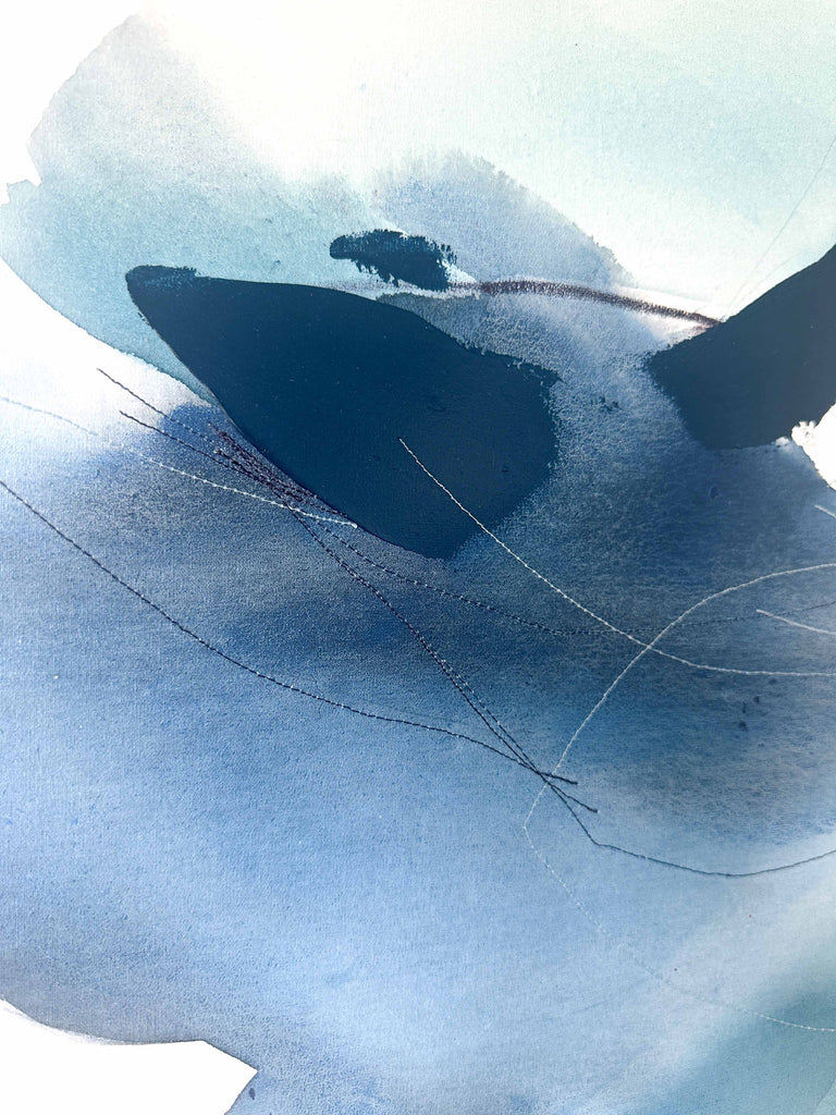 Deeann has a BFA from Memphis College of Art with a painting emphasis and has always been drawn to mixed media and collage. She took several fiber arts classes in college where she learned machine embroidery and sewing techniques. When she began working abstract a few years later, she combined these two techniques and found her own creative voice. She uses a sewing technique called free-motion machine embroidery on top of painted papers and incorporates those papers as collage.The stitched lines sit on top of fluid ink washes, colliding with bold paint scrapes and embellishing each piece with texture and delicate line, like veins running through the painting. “I am drawn to the tactility that the embroidery adds to the work both aesthetically and conceptually. The nature of thread is strong but intricate; it has a sort of permanence with the appearance of fragility.” Deeann has been in Nashville since 2018 and paints full time in her home studio with her two young daughters nearby.