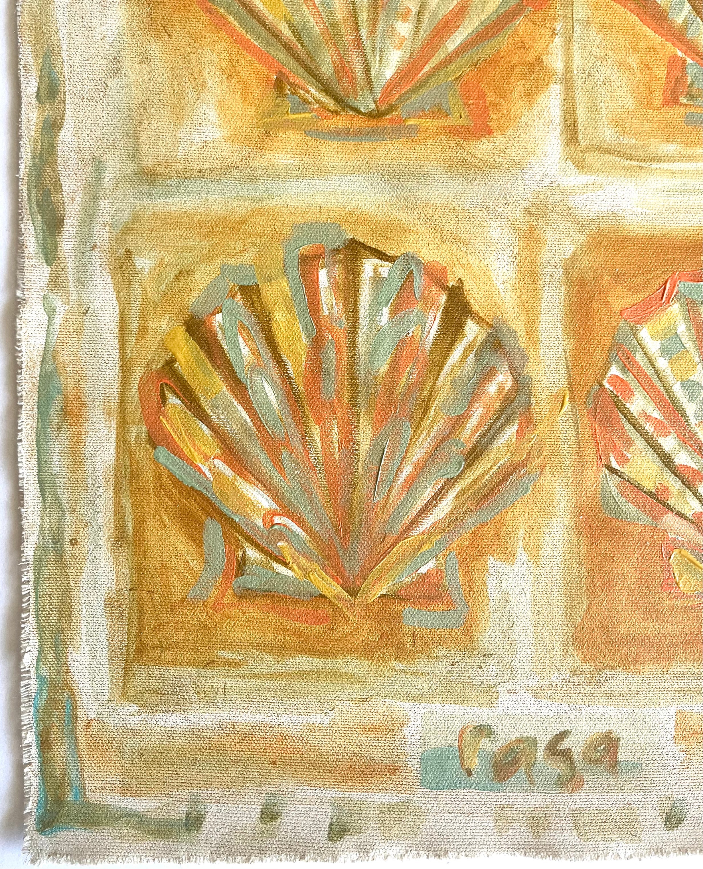 Pensacola based artist, Kelly Whibbs, finds her inspiration right at home on the Gulf Coast. The vibrant beauty and serene energy of her coastal town is infused into her work through layers of color and texture. Most of Kelly’s works are acrylic on canvas and feature organic forms one might find near the sea. She is probably most well known for her paintings of palms, which are featured in many of her collectors’ homes and businesses. Her most recent works are influenced by her seashell collection from a lifetime of beachcombing on Pensacola Beach and Maryland’s Eastern Shore. Kelly enjoys experimenting with scale and light, inviting the viewer to step forward and take a closer look. When she is not painting, Kelly can be found spending time with her husband, their three little boys, and their dog, Chessy. They are on the water whenever possible- whether boating, catching crabs, fishing, or just having themselves a beach day.