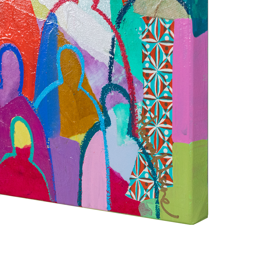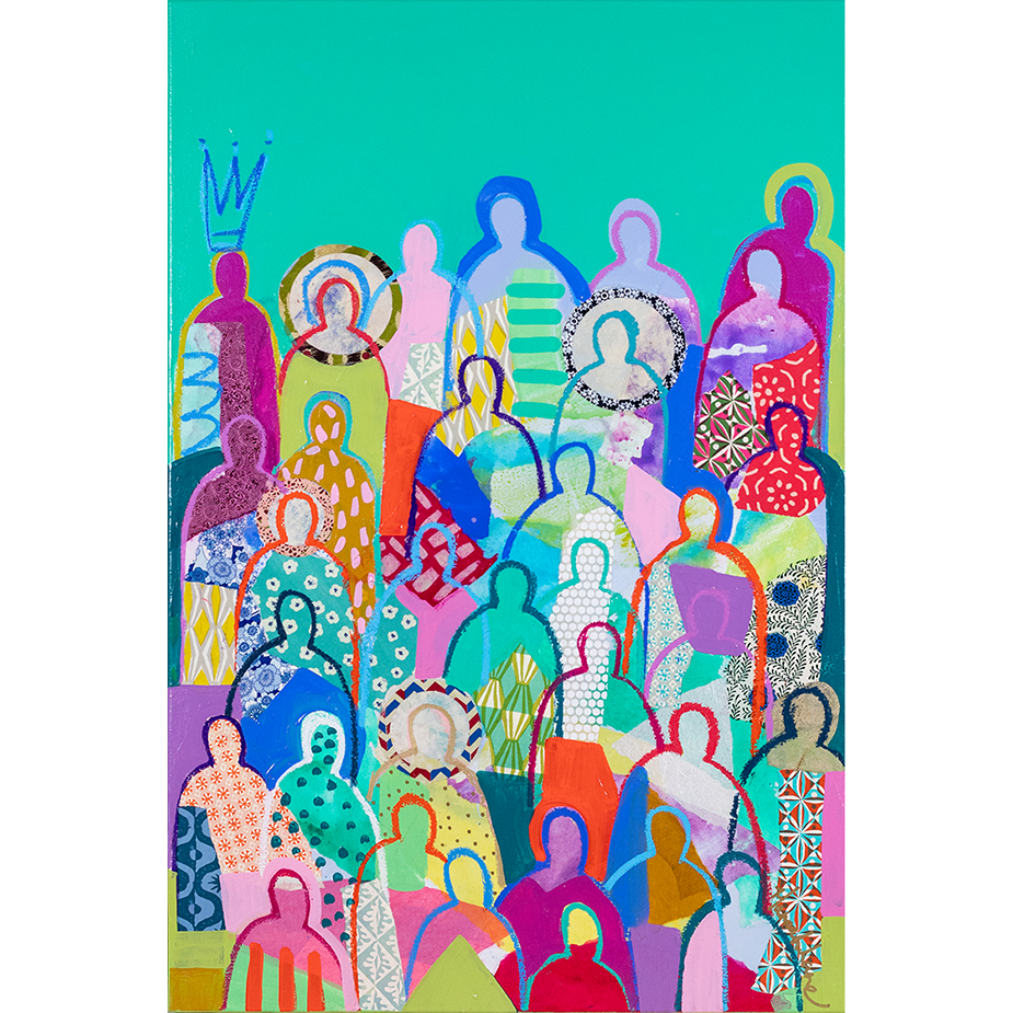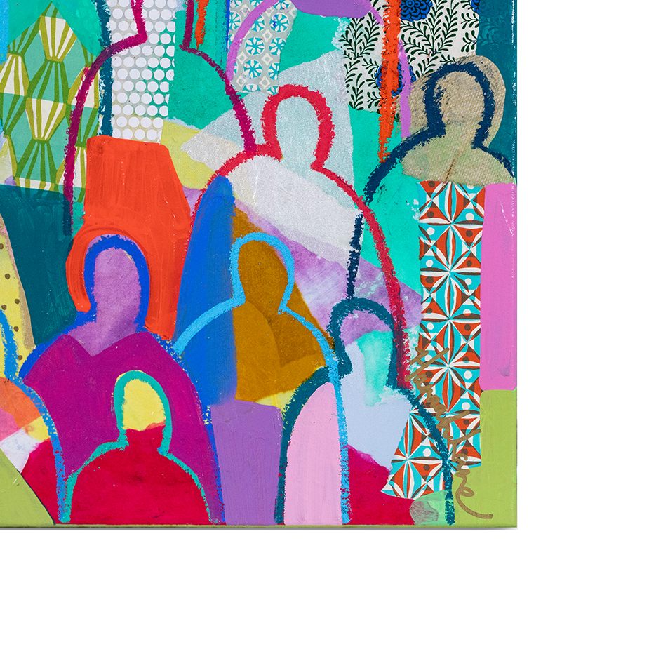 Hannah Lane is a contemporary mixed media artist celebrated for her bold use of color and dynamic, collage-like layering. A Louisiana native and graduate of the Savannah College of Art & Design, Hannah draws deep inspiration from the vibrant landscapes, diverse cultures, and heartfelt sense of family and community found in her southern roots. Her work blends pigmented Japanese papers, expressive line work, and rich washes of acrylic paint to create textured, energetic paintings. Each collection reflects her love for nature, storytelling, and community—an invitation to explore the beauty of her inner imagination. Hannah is represented by some of the top galleries in the Southeast, and her paintings are collected privately and in corporate spaces across the country. She also loves working one-on-one with collectors to create meaningful, custom pieces. After living and painting in Italy and New Orleans, Hannah now calls Nashville home, where she is part of a thriving art community. When she’s not painting in her home studio, you’ll find Hannah hiking with her boys, reading, or cooking up something seasonal and delicious! The crowd series is one of my most iconic collections, inspired by my big, beautiful Louisiana family and the joyful spirit of southern gatherings. I grew up surrounded by cousins, friends, and neighbors—many from families as large and lively as my own—where faith and family were at the heart of everything. Over the past 12 years, this series has evolved with new patterns, papers, and symbols that reflect the changing seasons of life. Each crowd painting is a kind of meditation, a reflection on the deep truth that we’re all connected. Rich with personal symbols and intuitive mark-making, these pieces push the boundaries of mixed media and invite you to see something familiar in a new way. Whether you're drawn to the vibrant energy, the quiet details, or the sense of belonging they evoke, each crowd carries its own unique aura—waiting for the right person to bring it home.