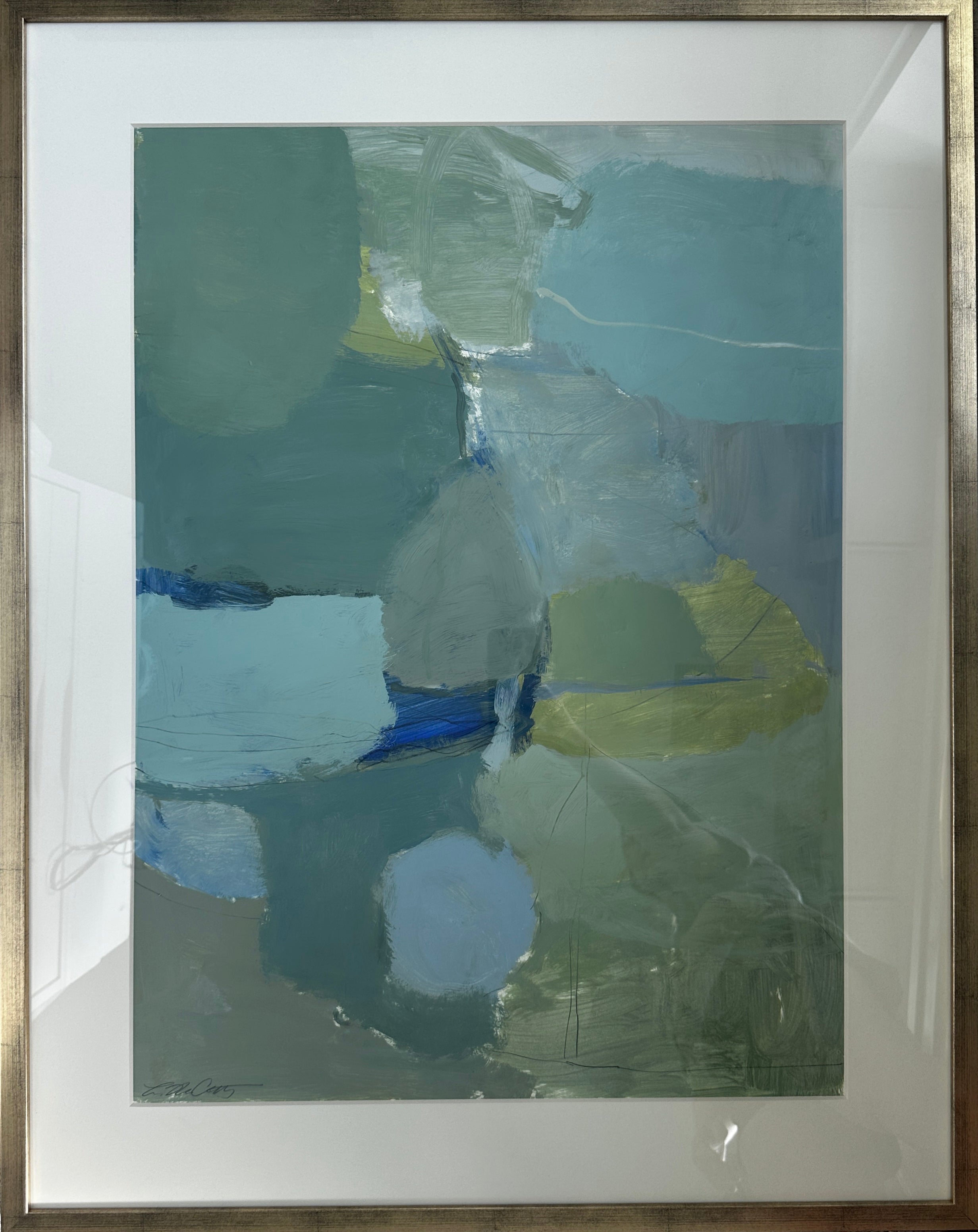 acrylic and charcoal on paper, in white mat and gold frame