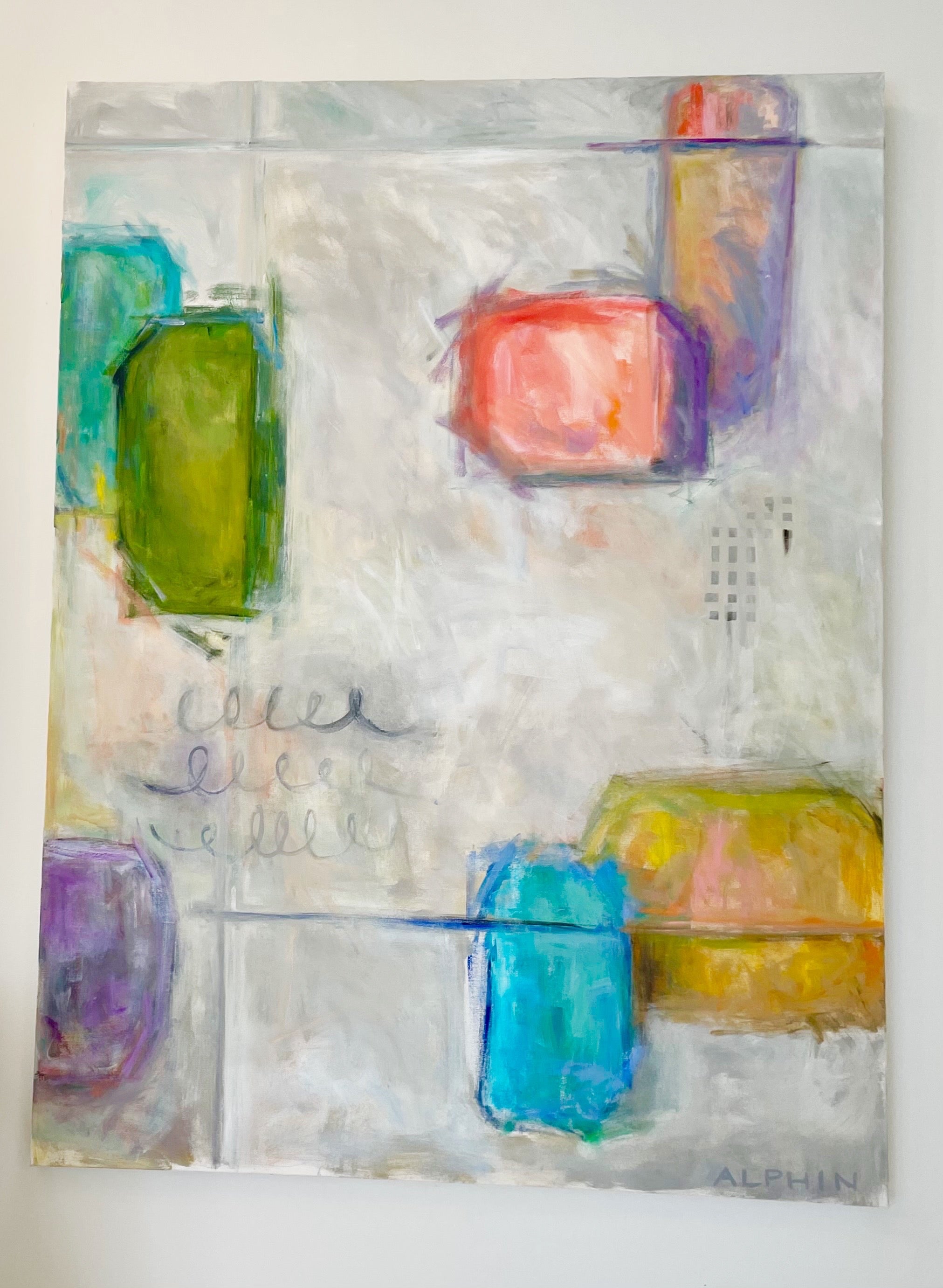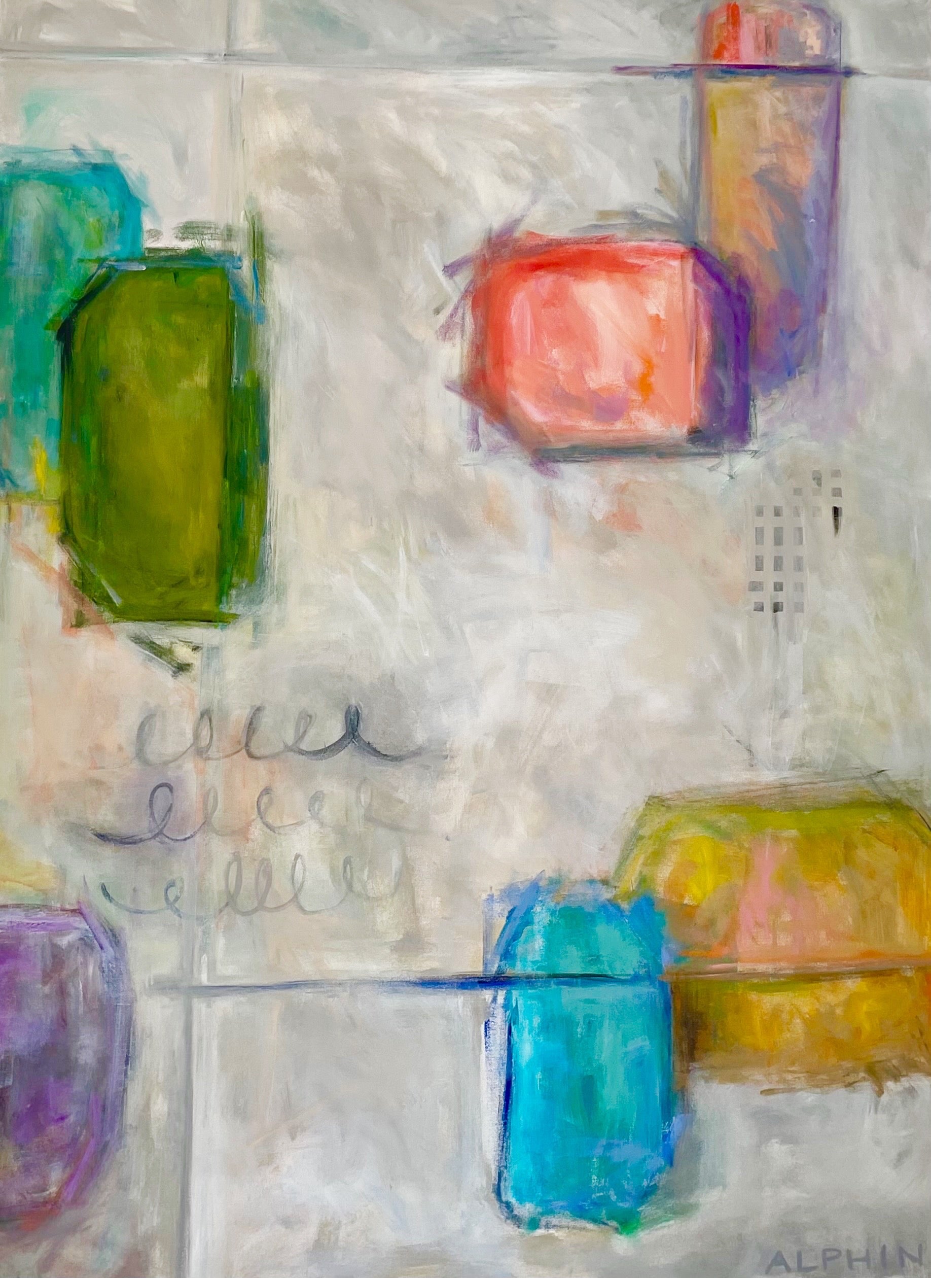 Debby Alphin grew up in Charlotte and graduated from the University of North Carolina at Chapel Hill, working first in advertising and later in software design. In 2003 after raising a family, she decided to pursue a second degree in architecture and began taking drawing and painting classes in order to create an entrance portfolio. The art won out and she began painting full time. She works in both oils and acrylics and describes her abstracts as a way to create order out of chaos. She has been fortunate to study with Elizabeth Ross, Andy Braitman, Nancy Franke, Jeanette LeGrue, David Shevlino, Gary Weiss and Gary Bodner. The California abstract artist, Nicholas Wilton, has been an incredible teacher and mentor. Artist Statement: “While architecture, geometry, symbols, and anything black and white have always inspired me, they are becoming much more apparent in my art. I like a certain amount of structure as I feel it grounds my work. From there I intuitively reference my own vocabulary of icons, both real and invented to create a narrative. I gravitate to straight lines, graphic shapes, lost edges and unique mark making to create a visual story which in the end I hope is as entertaining and appealing to the viewer as it is me, the artist. The joy is in the process.”