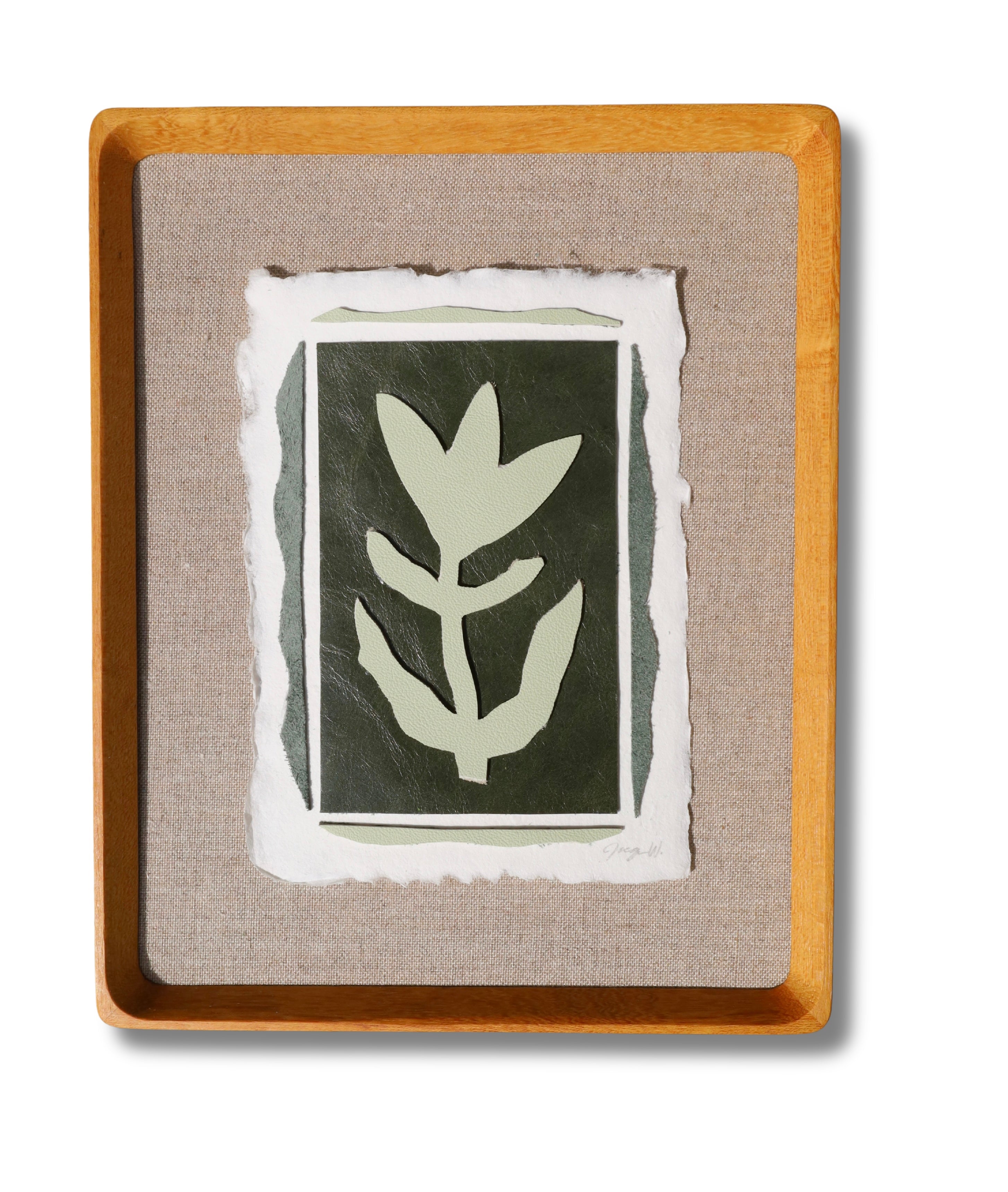 My passion as an artist comes from a life-long desire to create. Growing up with a parent in the military, I was consistently moving around from one place to the next, all the while collecting shapes, places and colors to put in my back pocket and one day use. I was always a painter but started to expand my idea of what could and couldn't be used as art in high school and continued until I finally found my material of choice while in college doing a project made of scrap textiles, including leather and other recycled materials. Years later, in 2018, I started my embarkment as an artist experimenting with different mediums and textiles that slowly evolved into my primary use of leather today. Currently, I live in Memphis, Tennessee with my husband, Alan, and our child, Arrison. When I'm not in the studio, we are often found enjoying local parks, taking nature walks led by our little one. Inspired by the landscapes I grew up seeing and my travels, I soak in my surroundings and then illustrate them in my own way through collages. I am always mesmerized with the way the calming colors and soft layered textures of my pieces can speak to others without using words. A little leather on a wooden panel creates a shared experience between you, the viewer, and me, the artist. This connection brings me such joy and compels me to create the way I see the world: full of color and unsuspecting textures.