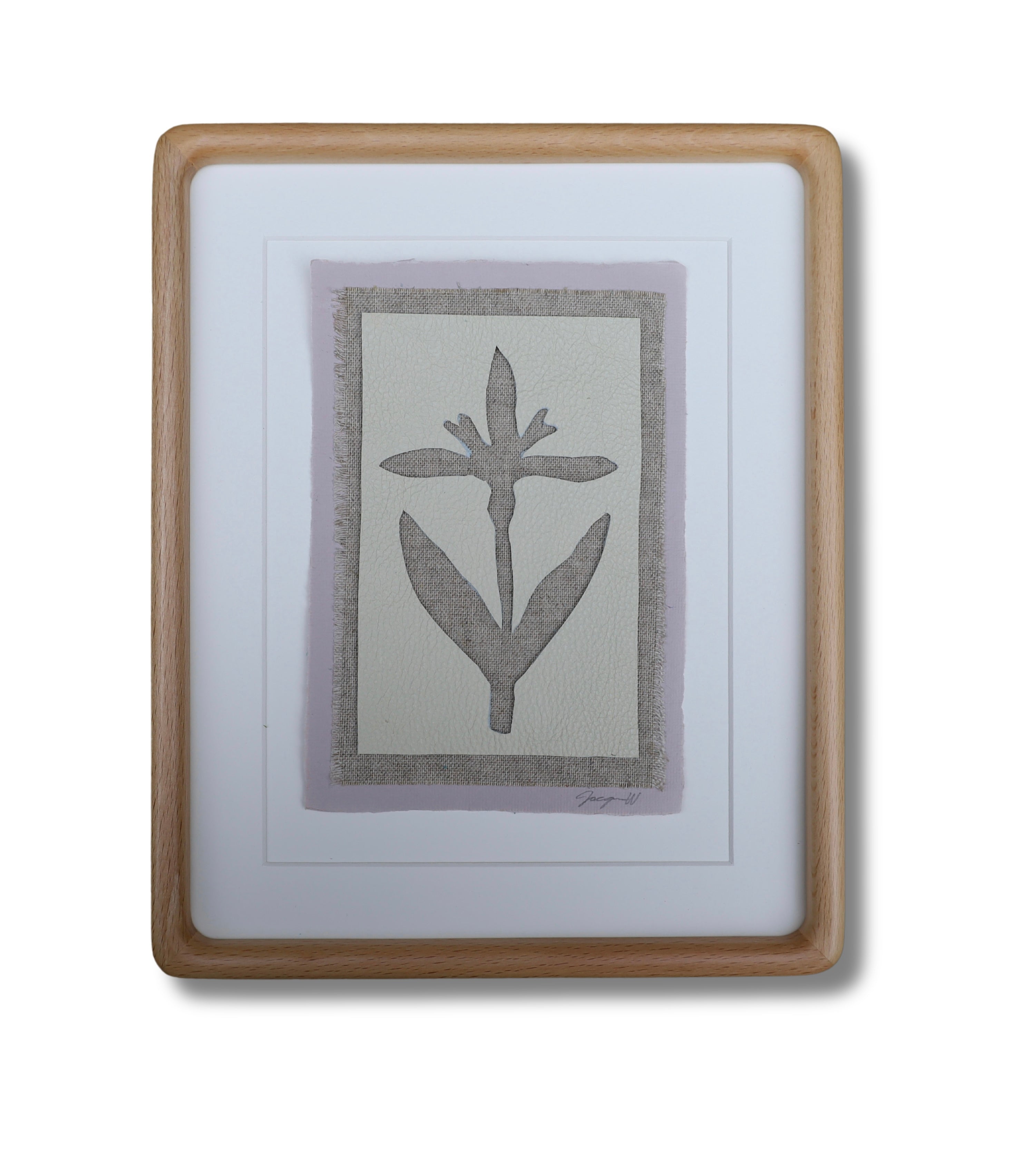 leather on handmade deckled edge paper, floated on cream mat in rounded wood teak frame
