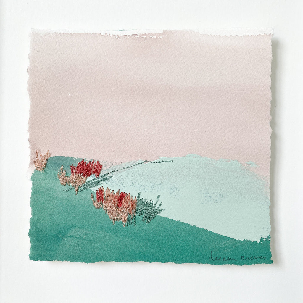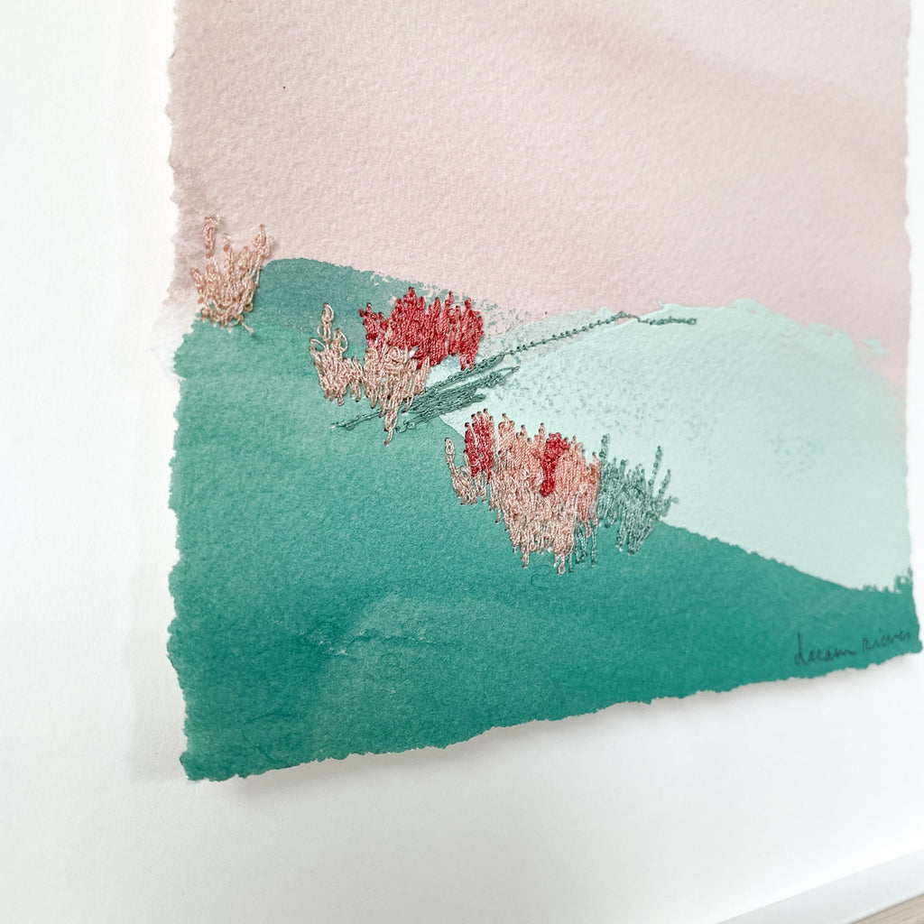 mixed media on paper, floating on white mat, in wood shadowbox frame