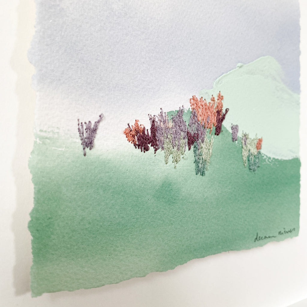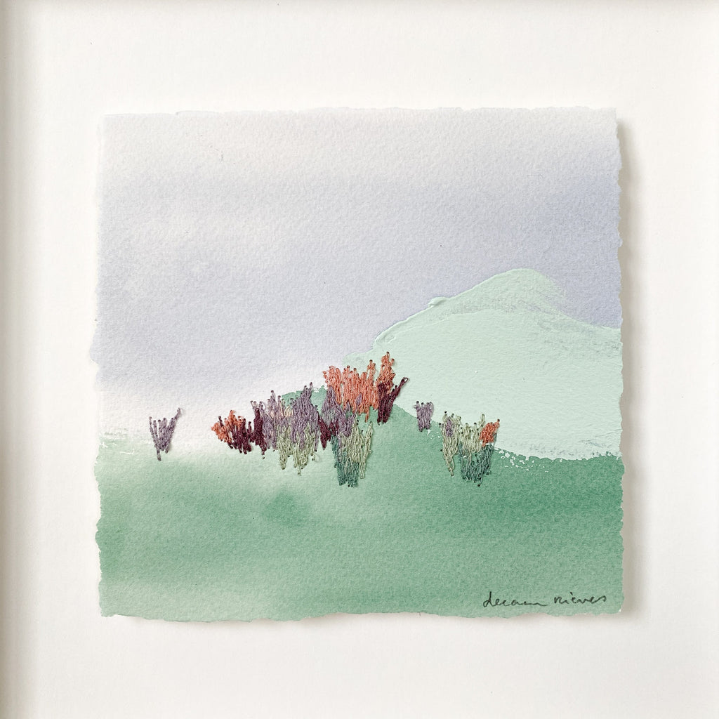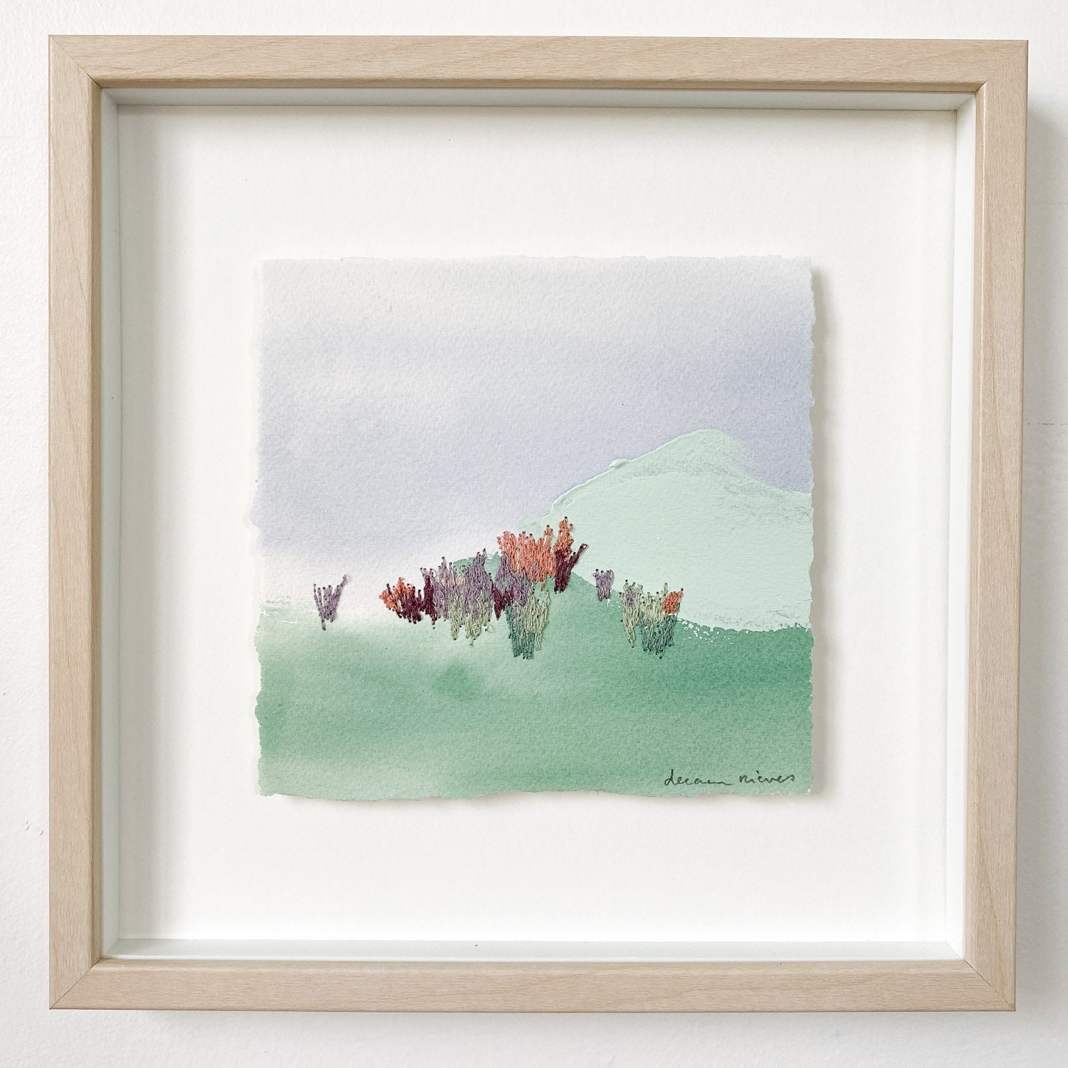 mixed media on paper, floating on white mat, in wood shadowbox frame