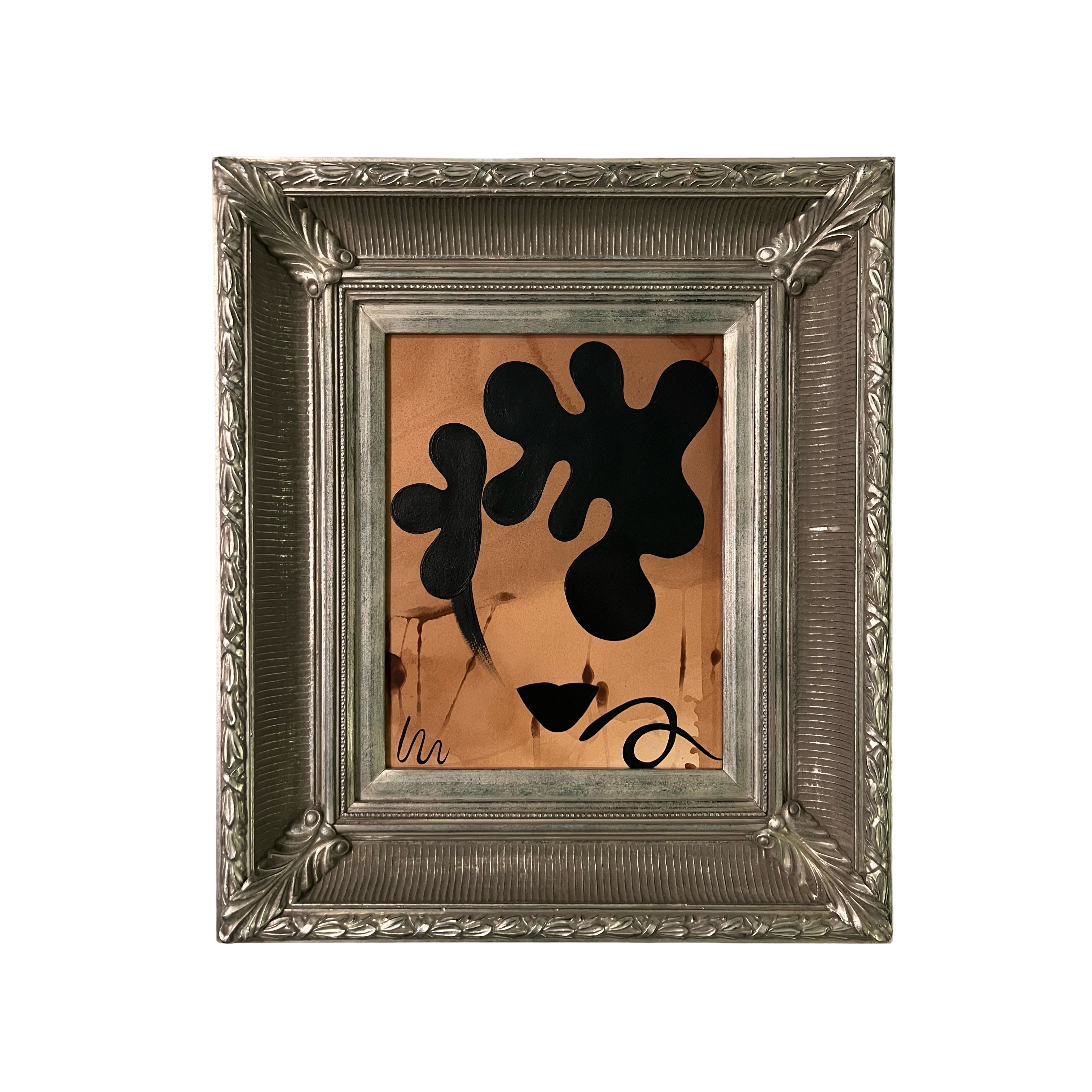 acrylic on tea-stained cold press paper, custom framed in antique ornate brushed silver frame, with UltraVue Anti-Reflection PlexiGlass