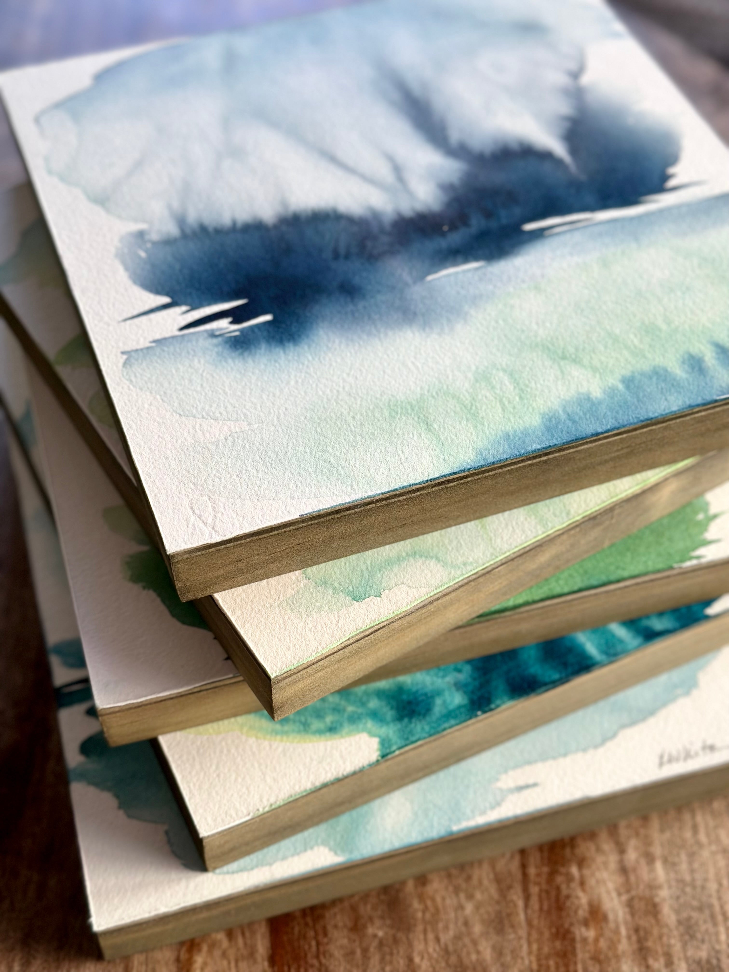 My art is heavily inspired by nature. Each creation takes on its own life, much like nature does when it unfolds. Many of my pieces greet you with a soft, serene atmosphere evoking a peaceful emotion, while others pull you in with the bold colors, telling their own story. I am drawn to the horizon line, the space where land or water meet the sky, a quiet pause at the end of the day as the sun sets, a deep exhale, or a place to root yourself to the earth. It reminds me of how important it is to stay grounded in the world we live in today.​ I received my BFA in Illustration from Washington University in St. Louis. I taught elementary art for many years and have been a professional artist for the past 5 years. In addition to my studio practice, I lead watercolor workshops and retreats. This work allows me to connect with women, teaching them how to use the medium as a tool to ease anxiety. My painting practice is what grounds me daily. I love sharing with others how to set intentions and being mindful with their own creativity.