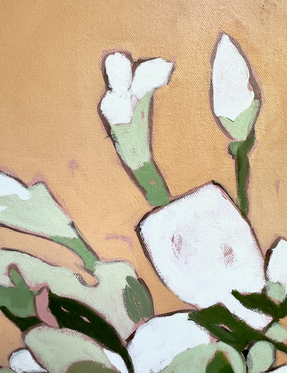 Pamela’s intention as a painter is to speak to the elegance of place and object; to use paint as a means to capture an image and then to reduce the noisy elements in landscape, botanical or interior subjects, by breaking down busy images into an economy of shape and hue. “I love a quiet place. I love to have the brain space to allow my mind and my eyes to soak in the images of my world. In the same manner, the image I want to paint must also speak to my need for simplicity and peace. Our world is a busy, loud and cluttered place. I can paint those elements out, leaving only lovely positive and negative shapes, made with colors that love to be together...” Painter and avid gardener who is fascinated with color, inspired by music, good reads and lessons to learn, Pamela works from her studio with windows that let in the woods of Northeast Georgia, where she lives with her husband Van, dog Tuck and friendly wildlife.