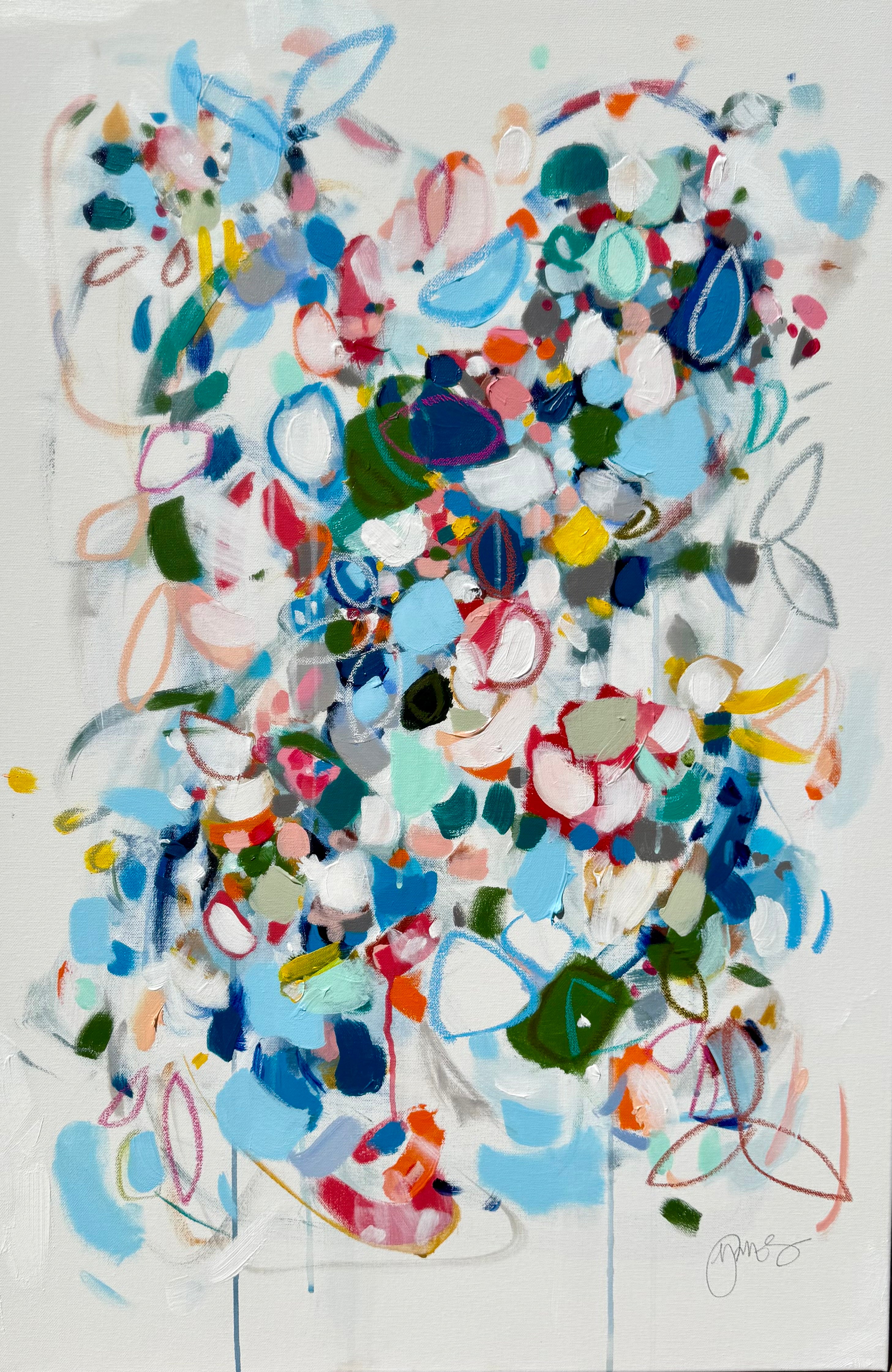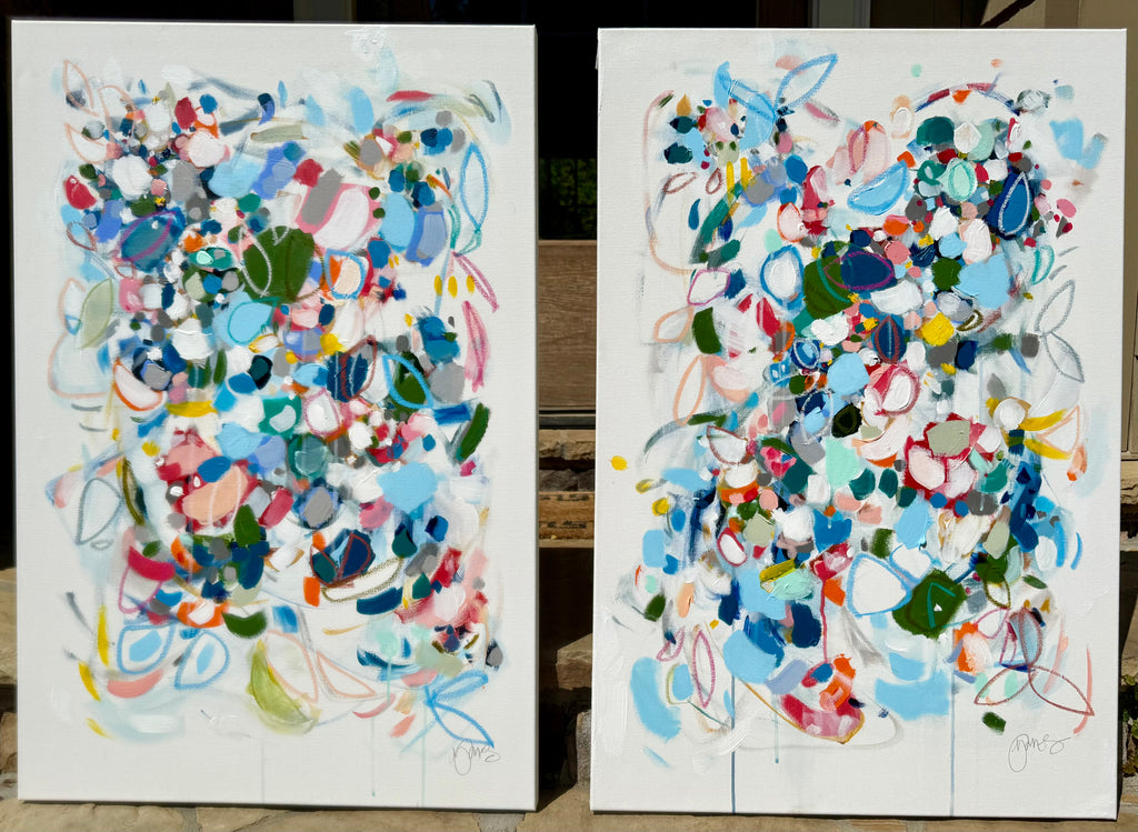 Michele James is an abstract painter known for her large works on canvas. She is inspired by color and movement and uses strong brushstroke and varied marks on neutral canvases with pops of bold colors. She paints with acrylics , and uses chalk, oil pastels and pencil to vary the texture and medium of her works. She is influenced by the colors in nature, the lightness and space of the sky, and the texture and depth of landscapes. “I love to make people happy and for a client to add my painting to their home is wonderful compliment” Michele received a BFA in fine art and art history at Hunter College in New York, NY with a concentration in studio painting. Michele paints out of her home studio in Atlanta where she lives with her husband and three kids.