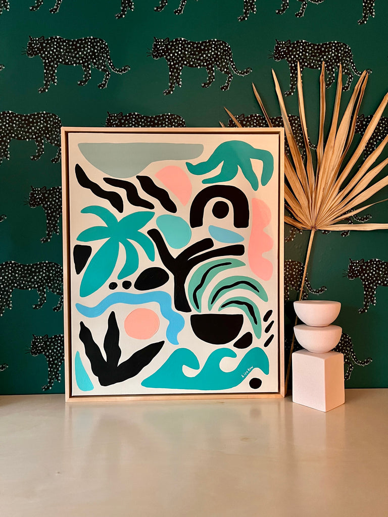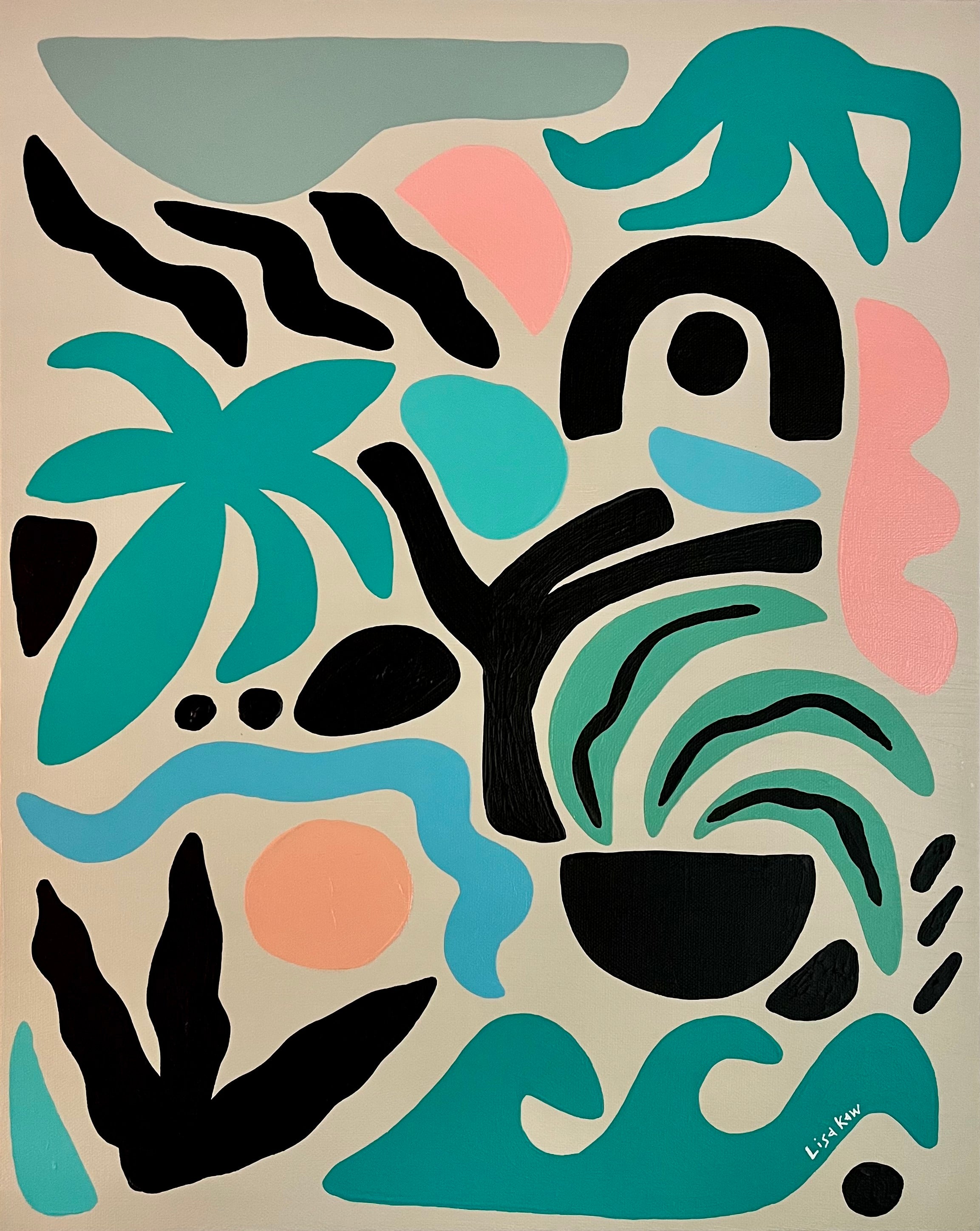Totally tropical Lisa Kaw shares her love for nature and travel through her vibrant paintings. From her South Florida jungalow, she uses acrylic on canvas to transform the beauty around her into tangible one of a kind treasures. A minimalist at heart, Lisa thrives best when surrounded only by the blues and greens of the natural world and the curious melody of the rainforest chatter. Bali and the Big Island of Hawaii are her most sacred visited places. With a playful palette and a joyful spirit, Lisa Kaw creates work that simply and purely communicates the wonder of our natural world.