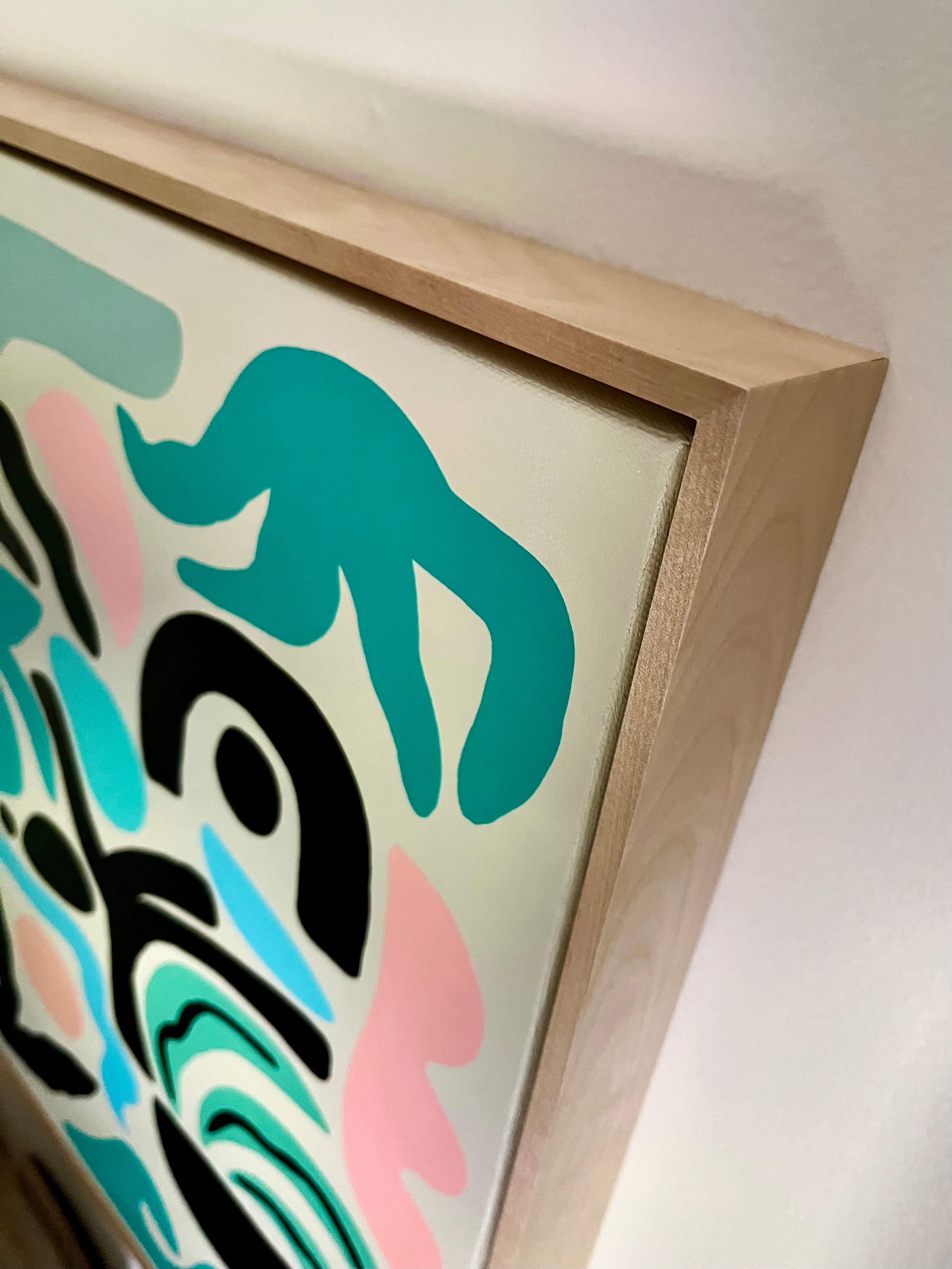 acrylic on gallery wrapped canvas, in light wood floater frame
