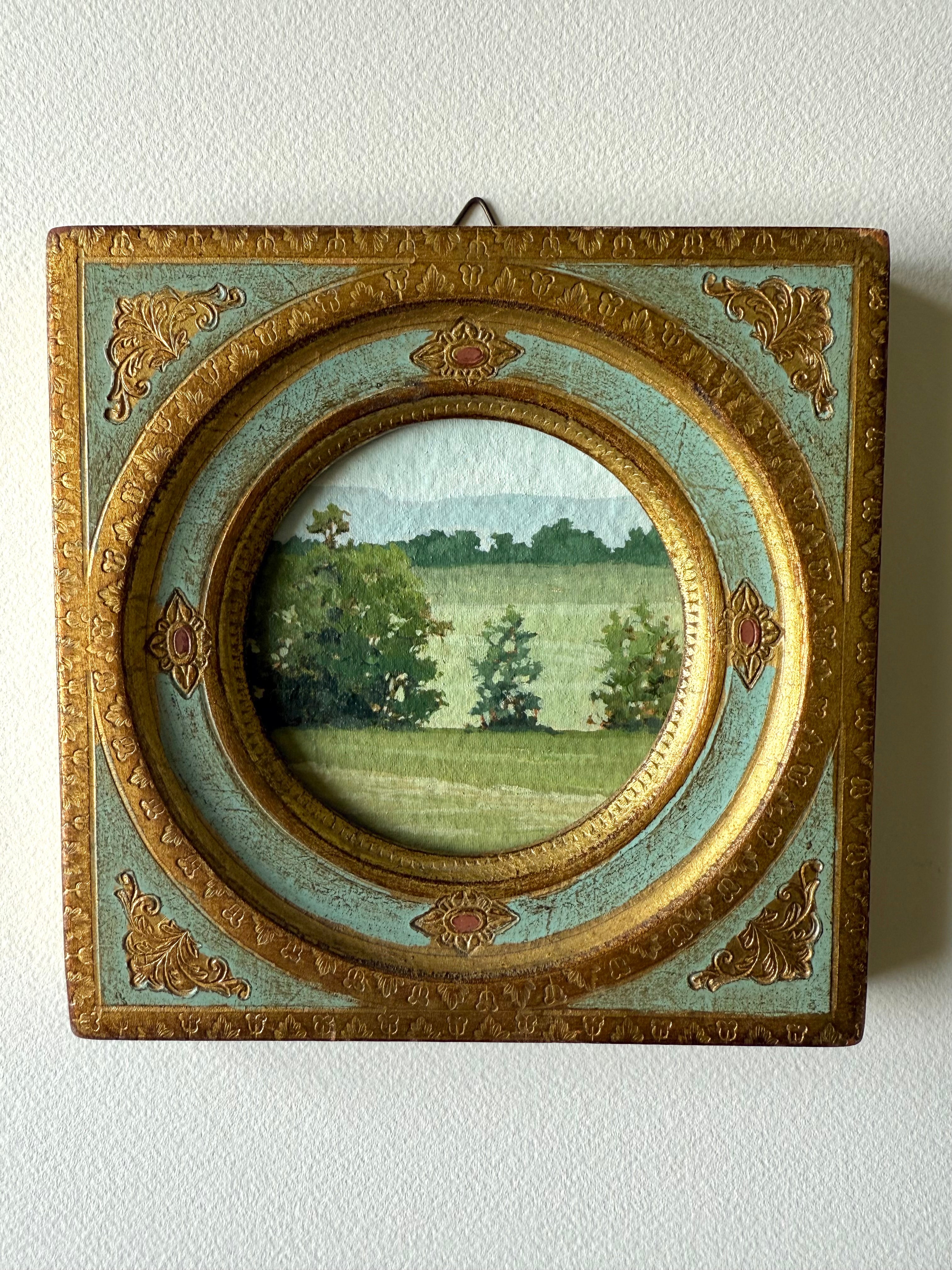 Jennifer was born in Jackson MS and moved to Nashville as a child. She enjoyed art as a child and painted with oils a bit as a teen, but ultimately went to MTSU to earn a degree in nutrition. Jennifer didn’t truly begin painting again until her children were in school full time, and started simply by painting pieces she wanted to hang in her own home. Discovering a love for vintage and antique frames (not to mention looking for these frames both in-person and online), she began pairing them with her favorite paintings. She paints primarily in acrylics on handmade paper. “I love the juxtaposition of a vintage/antique frame with the freshness of a modern landscape on textured handmade paper; the marriage of that tradition and history combined with the fresh clean colors in my pieces brings me joy.” She finds inspiration in clouds and trees and the hunt for the perfect vintage frame. Jennifer lives in Nashville with her husband and two boys.
