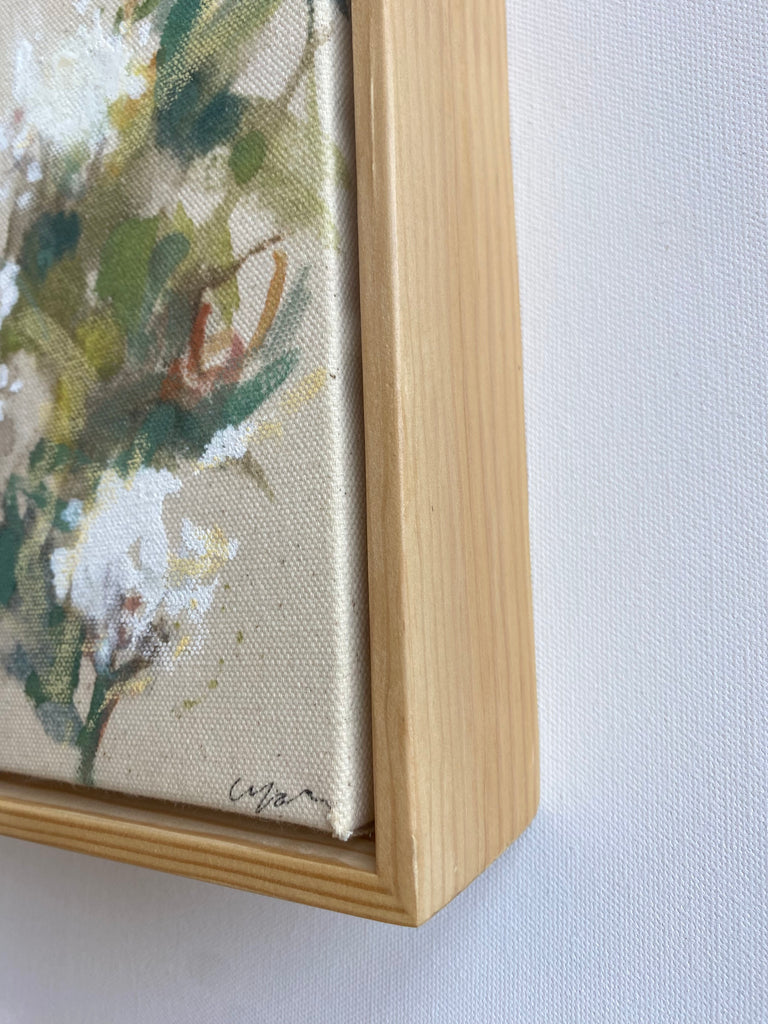 egg tempera and oil stick on canvas, in douglas fir floater frame
