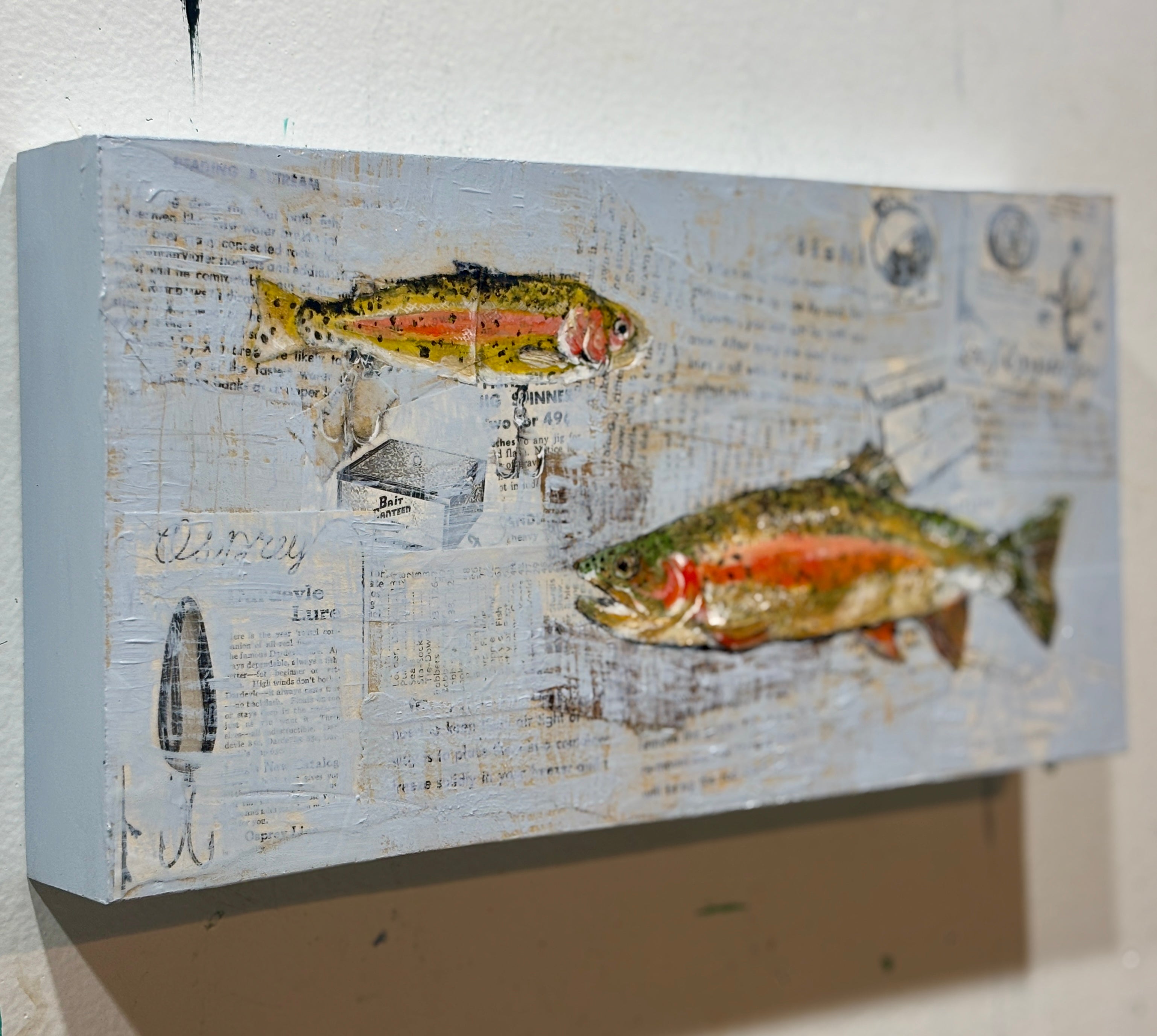 A lifelong artist, I make art because coming up with an idea is what gets me out of bed in the morning and into my studio, mercifully located in my home. So much of what I love in life is at home- my pets inside and wildlife out, nature pouring through the windows, comfortably cluttered rooms full of books and art, the forest surrounding me. My art originates with that early morning idea, a daily walk in the woods, the imagery around me. The deep connection to my surroundings is reflected in the art I make, even using pages of books in my art and the book itself as the canvas with the animals love as the subject. Animal and landscape renderings in mixed media, storytelling dioramas and large works on canvas all have a similar feel of natural wonder.