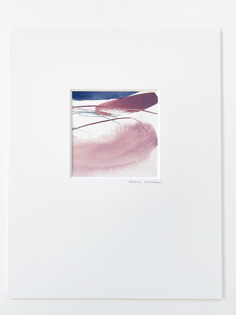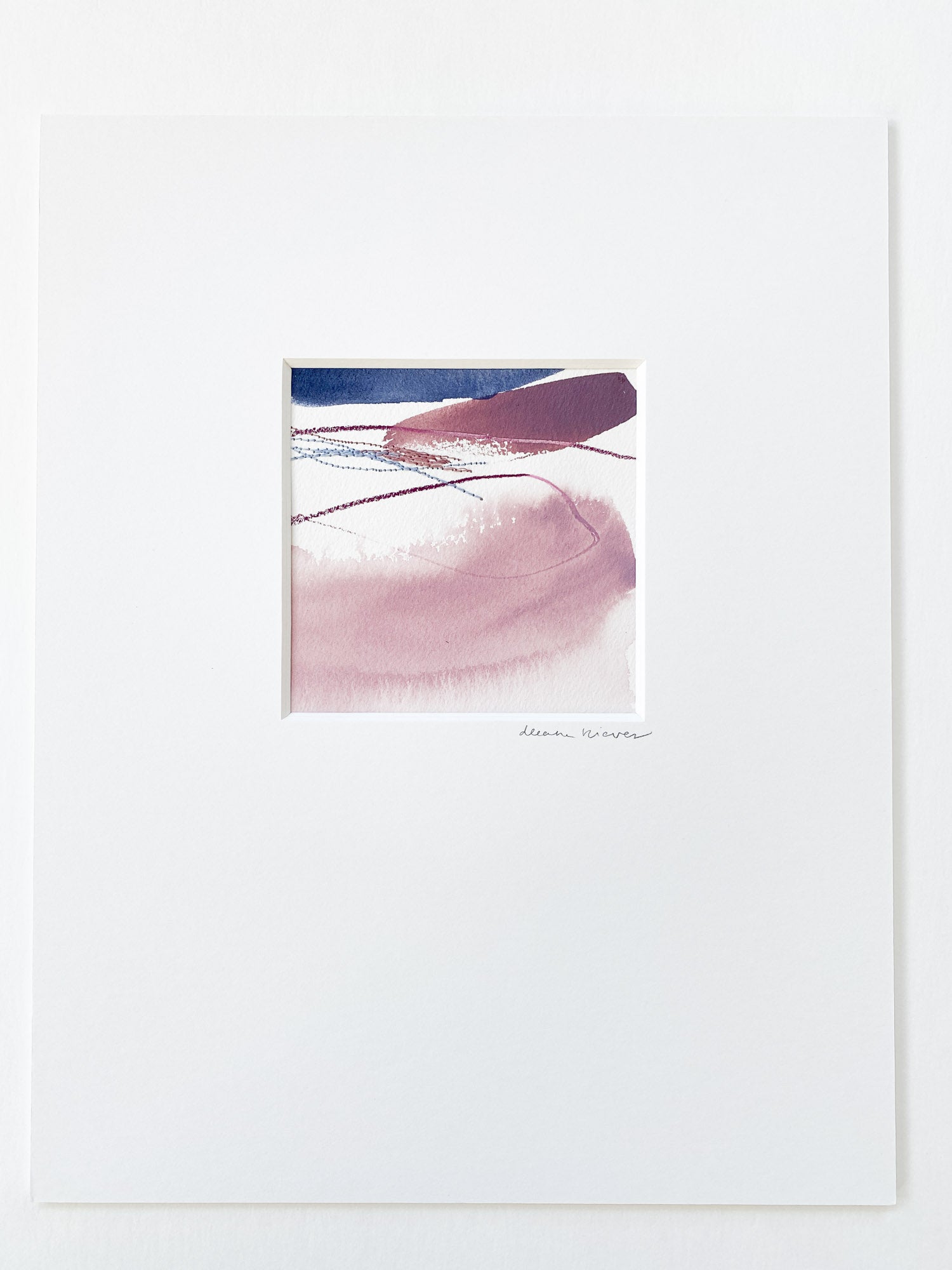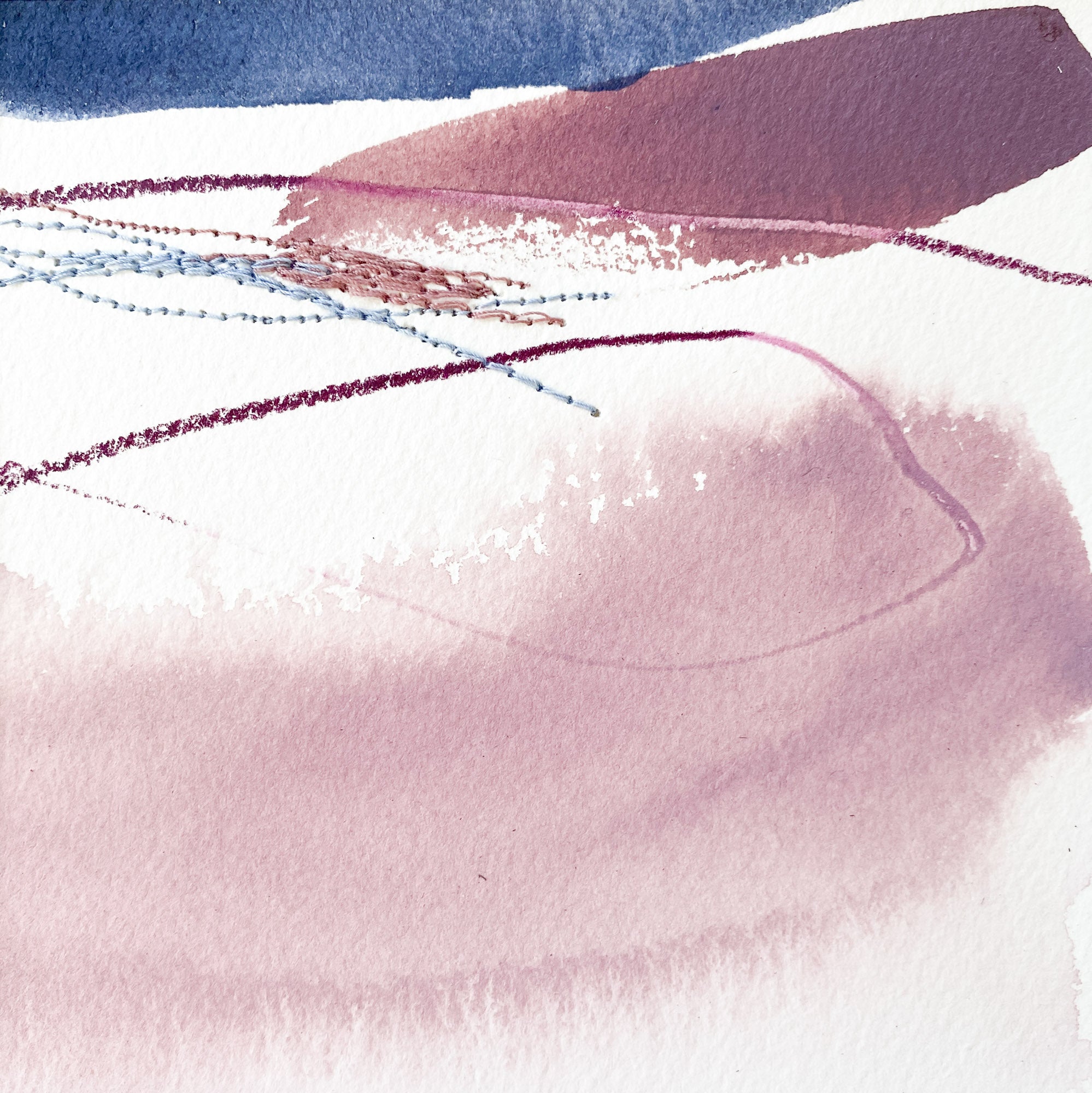 Deeann has a BFA from Memphis College of Art with a painting emphasis and has always been drawn to mixed media and collage. She took several fiber arts classes in college where she learned machine embroidery and sewing techniques. When she began working abstract a few years later, she combined these two techniques and found her own creative voice. She uses a sewing technique called free-motion machine embroidery on top of painted papers and incorporates those papers as collage.The stitched lines sit on top of fluid ink washes, colliding with bold paint scrapes and embellishing each piece with texture and delicate line, like veins running through the painting. “I am drawn to the tactility that the embroidery adds to the work both aesthetically and conceptually. The nature of thread is strong but intricate; it has a sort of permanence with the appearance of fragility.” Deeann has been in Nashville since 2018 and paints full time in her home studio with her two young daughters nearby.