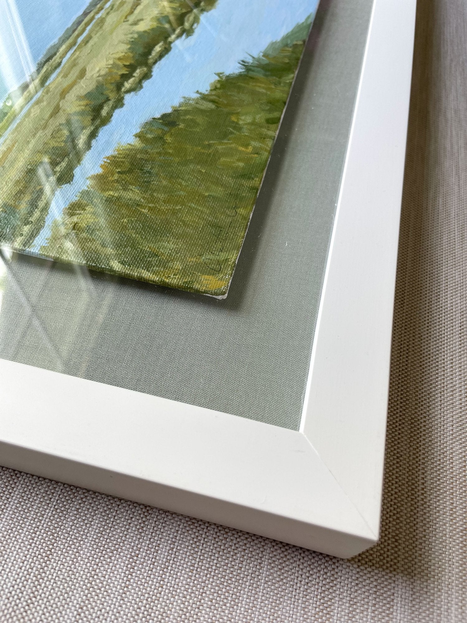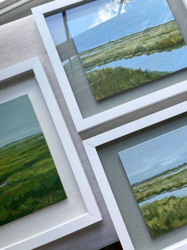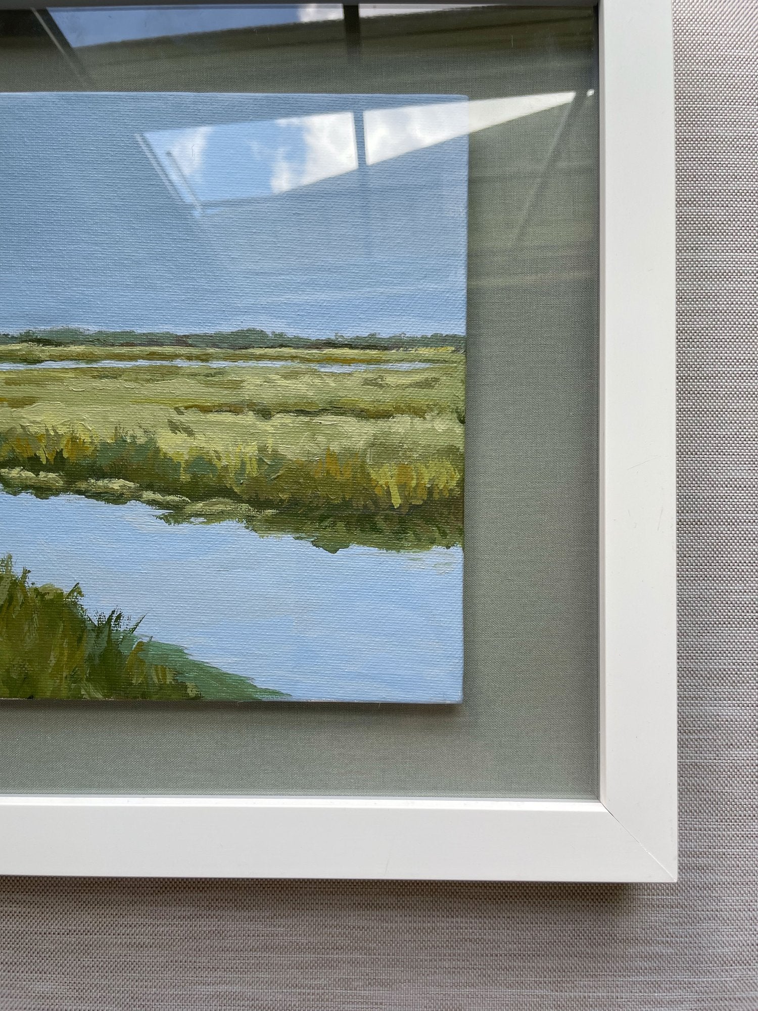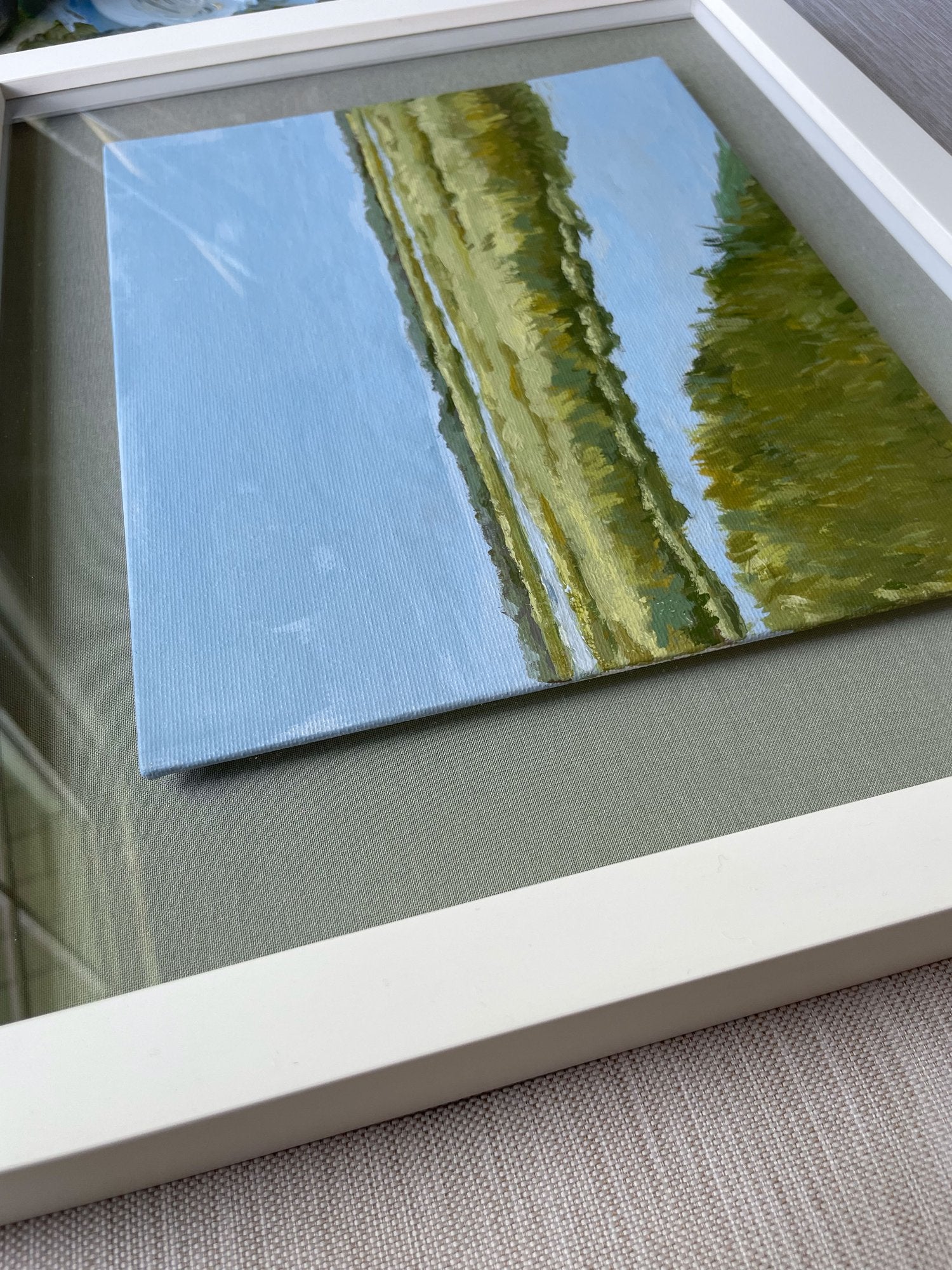 acrylic on canvas panel, floating on gray mat, in white shadowbox frame
