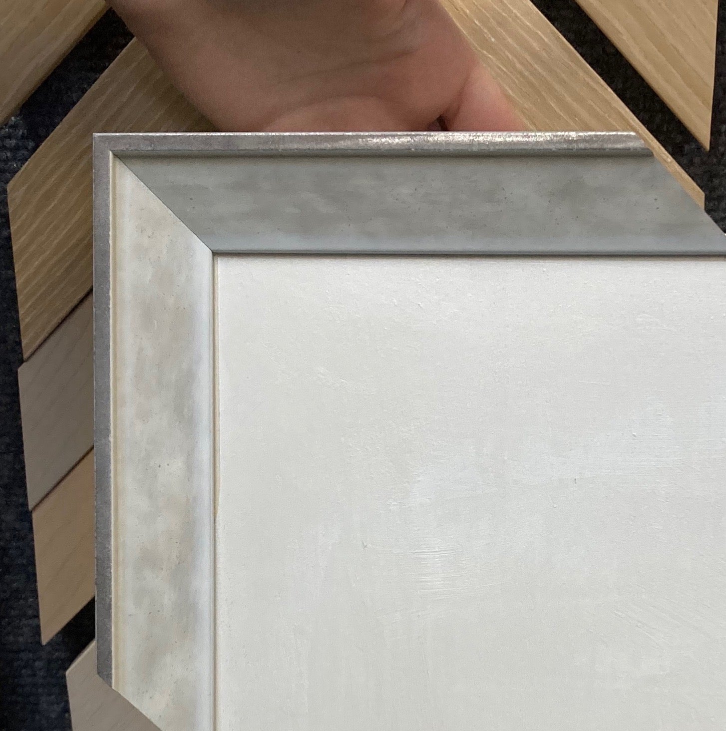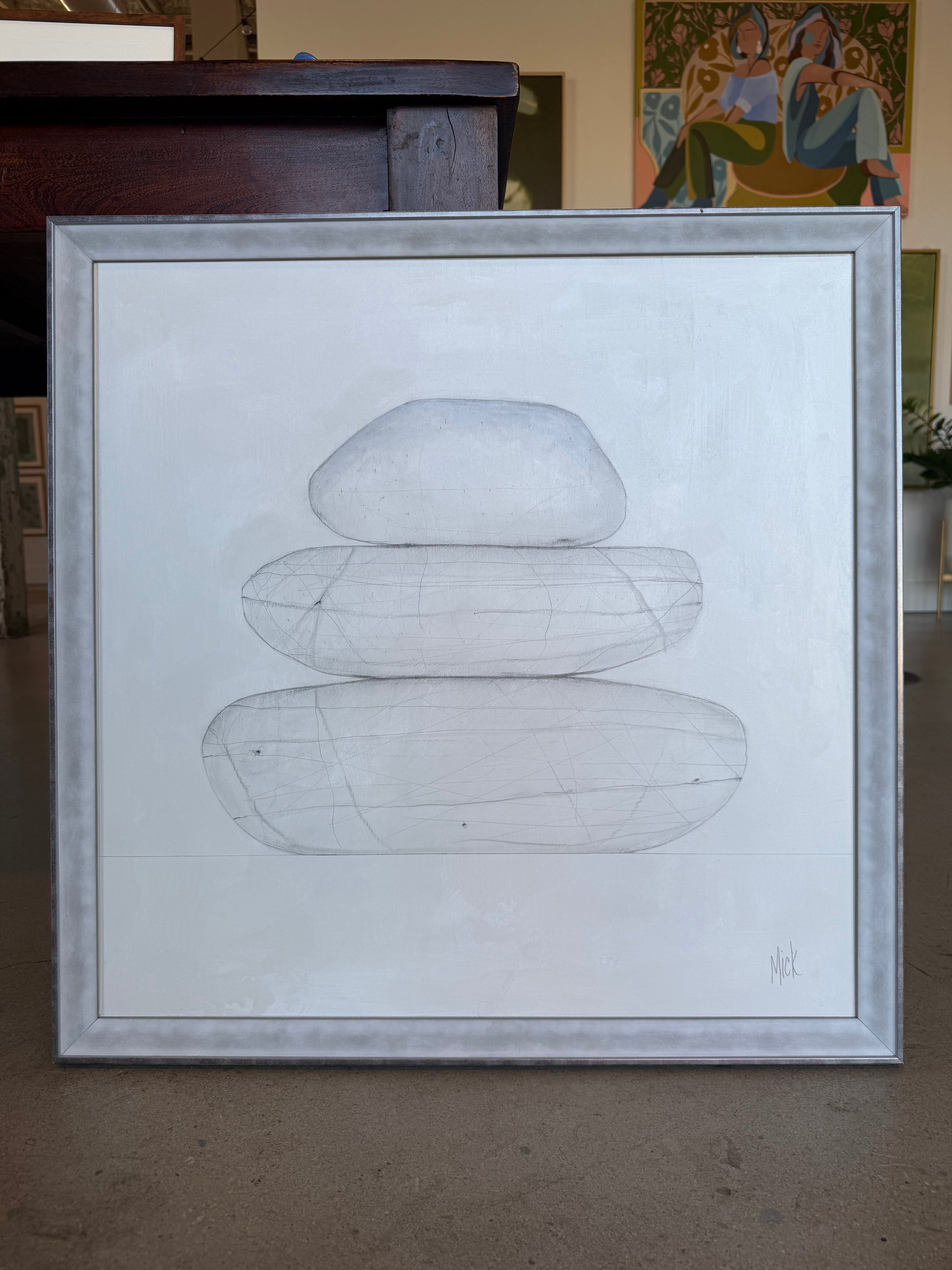 acrylic and mixed media on gallery wrapped canvas, framed in silver frame