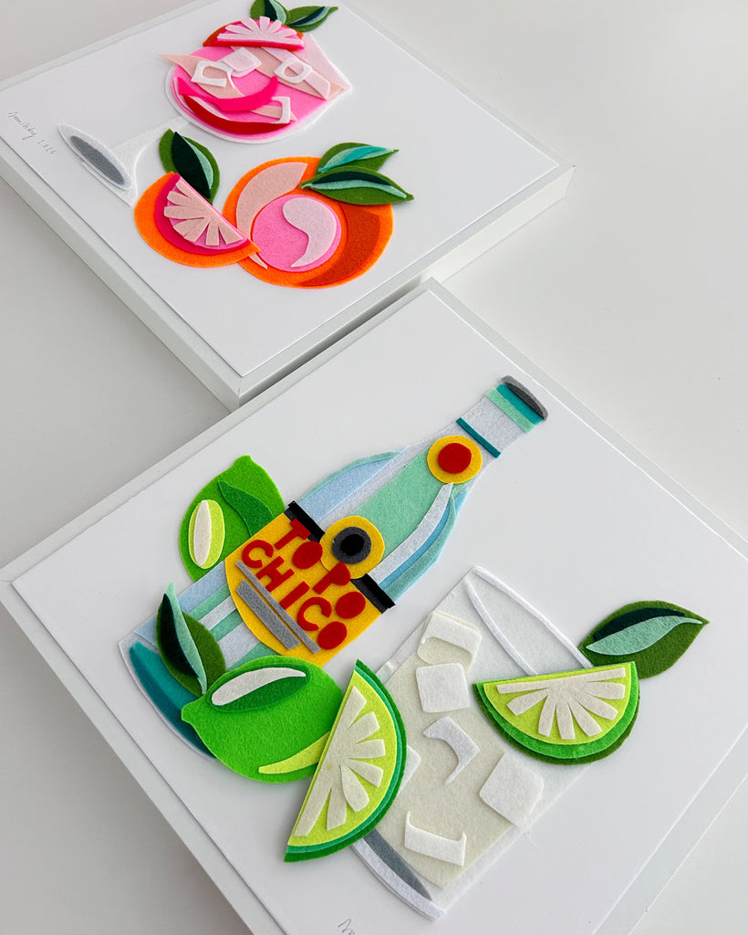 Sam Sidney is originally from New York, and moved to Charleston in 2007. She studied Studio Art at Skidmore College in Saratoga Springs, and earned a Masters in Art Education from NYU. For many years she was an illustrator, but it wasn’t until the quarantine that she started working with felt. She promised herself she would do an art project with her kids each day. One day, she pulled out a small box of felt and made some collages. She made a self portrait out of felt, posted it online, and the rest is history! She free hand cuts felt pieces to create protists of celebrities, pets, food and drinks. When she is not making things out of felt, you can find her at the beach with her 4 kids and 2 dogs.