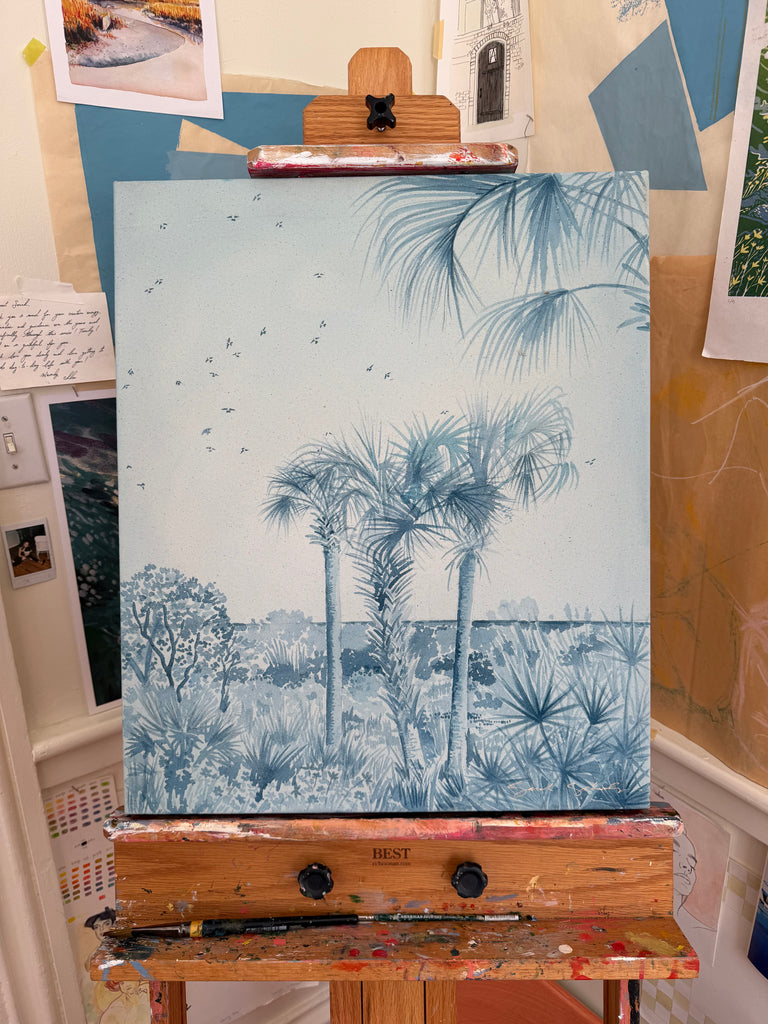 Much of Sarah Schools’ work reflects the warm, seasonal glow of the Carolinas. As both an oil painter and watercolor artist, she finds joy in discovering color in unexpected places—whether it's the dreaminess of golden hour, the soft depth of a cornflower blue shadow, or the delicate light that appears when the sun hits just right. Her creative process often involves experimenting with color to convey mood and atmosphere, layering bright hues and subtle tones with careful detail. Recently, she has been especially drawn to the flora and fauna of the Southeast, capturing native plants, trees, and the wildlife that inhabit them.