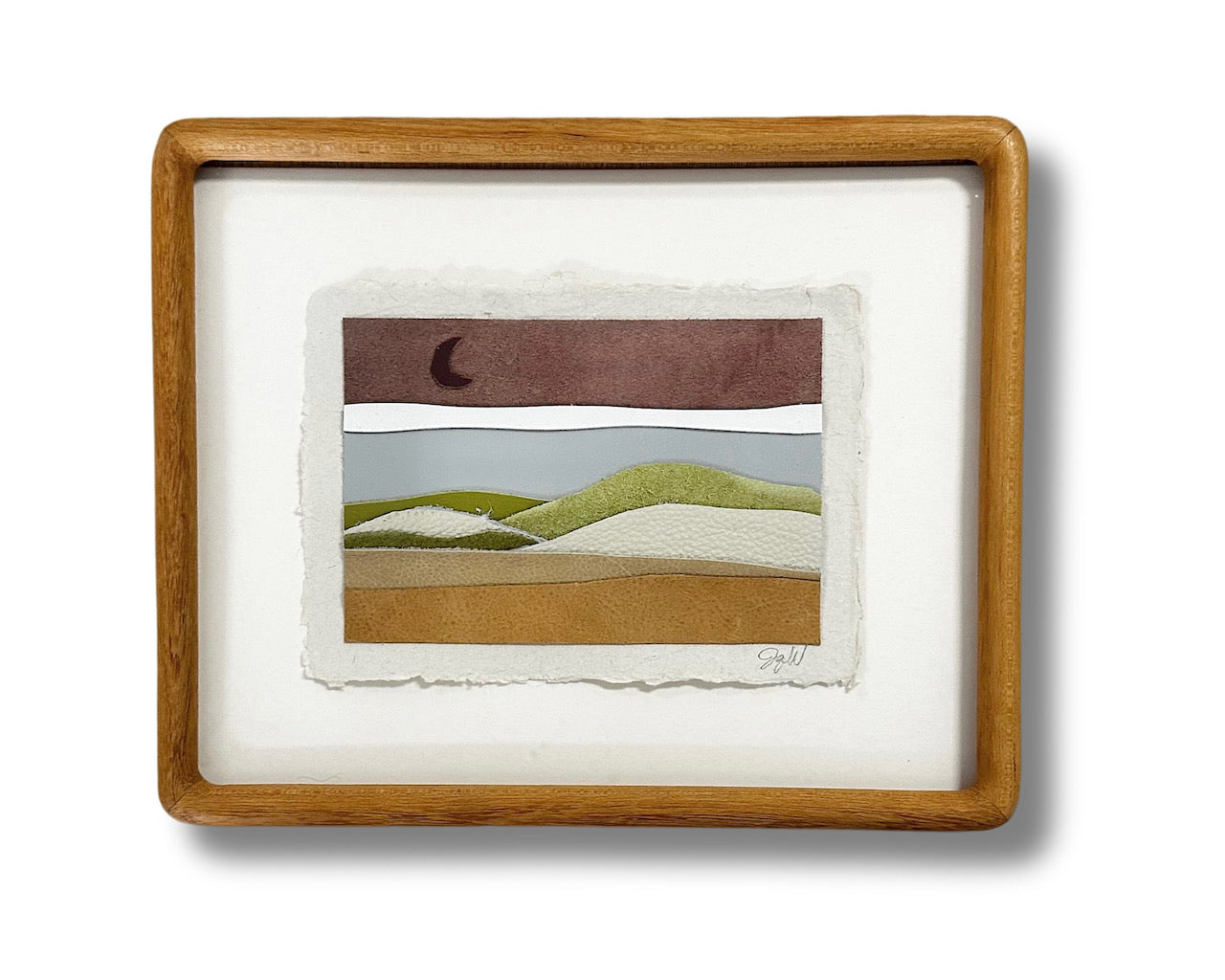 leather on deckled edge paper, floating on white mat, in rounded-corner wood frame