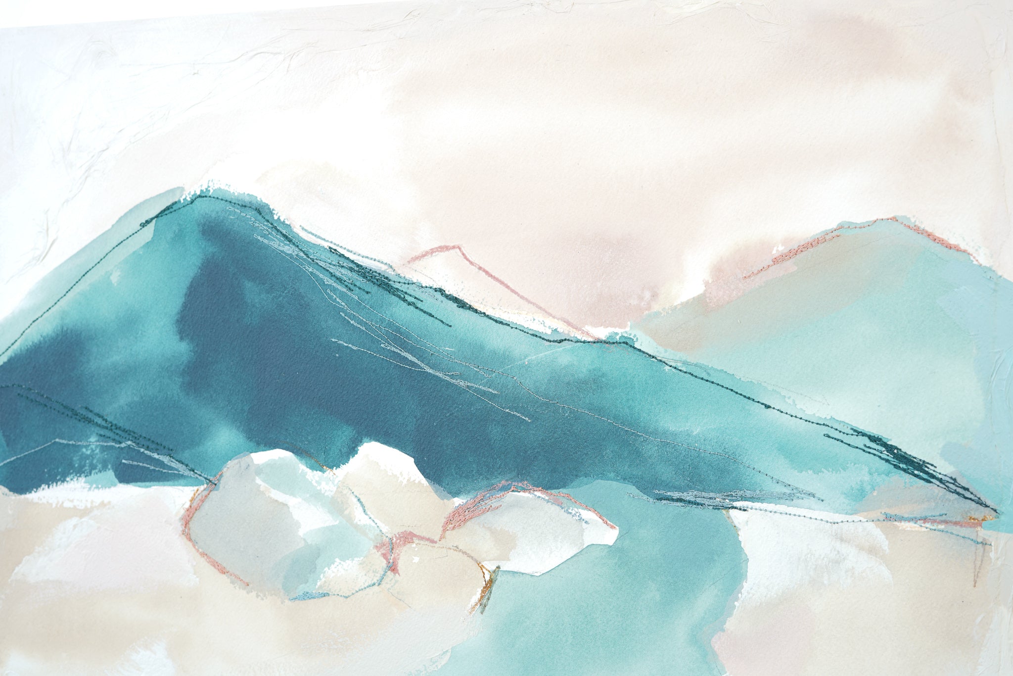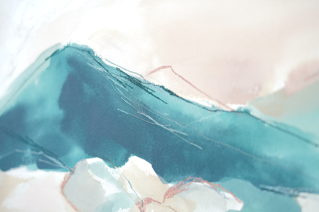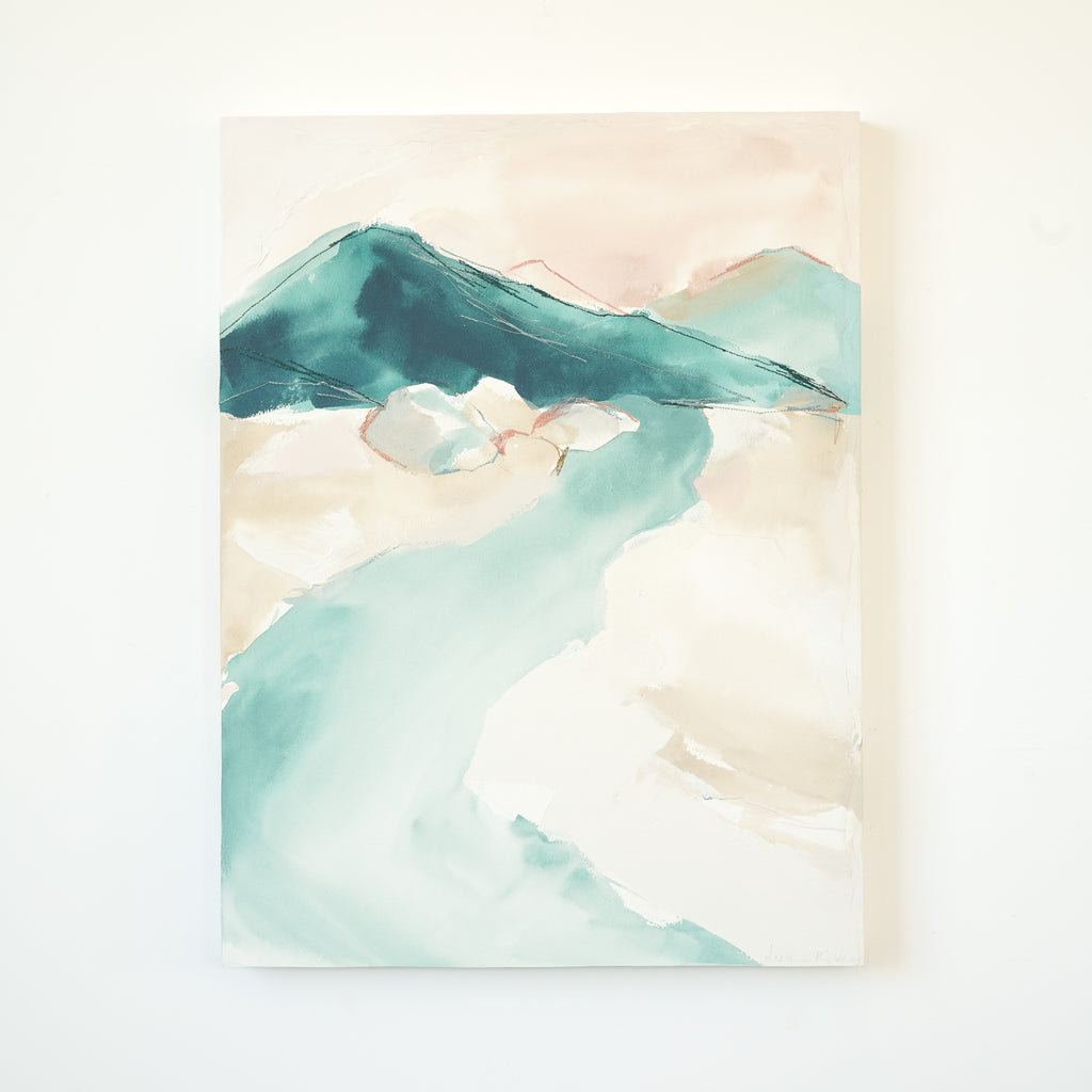 mixed media on cradled wood panel, framed in natural wood frame