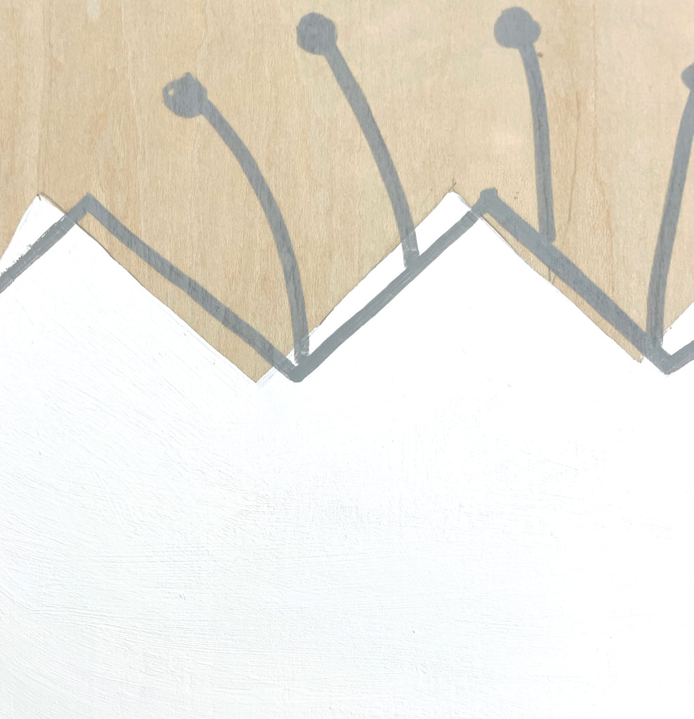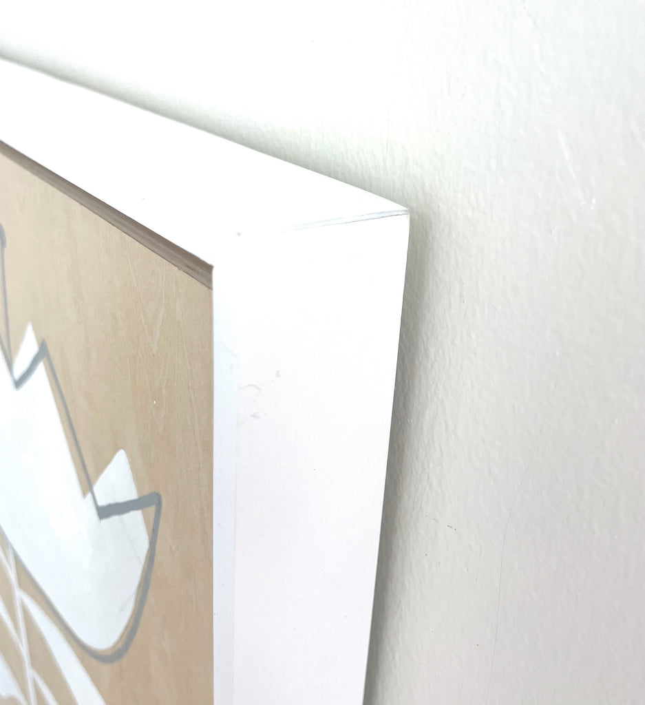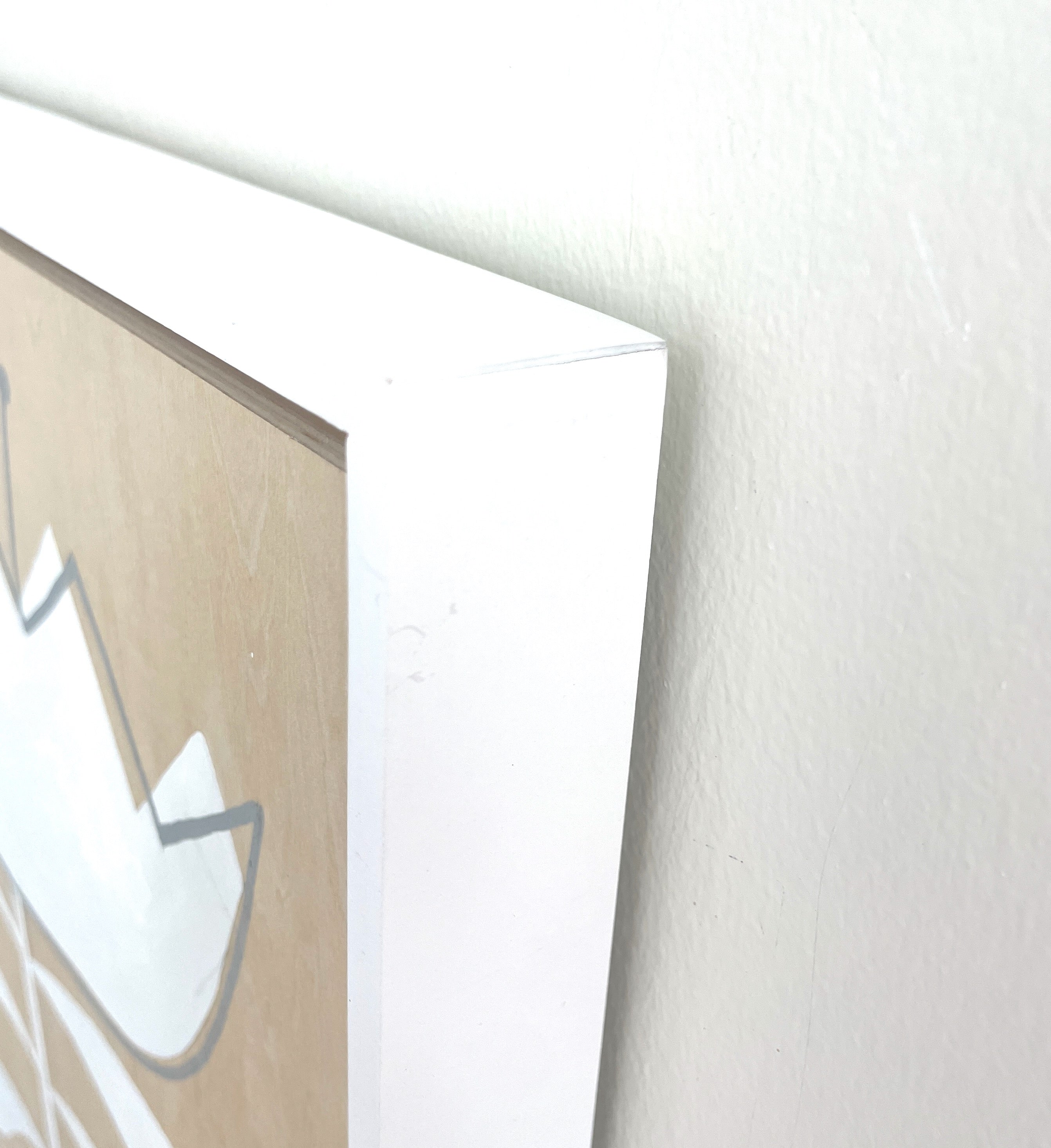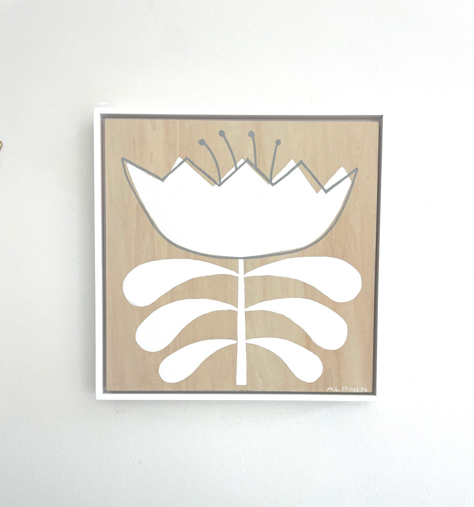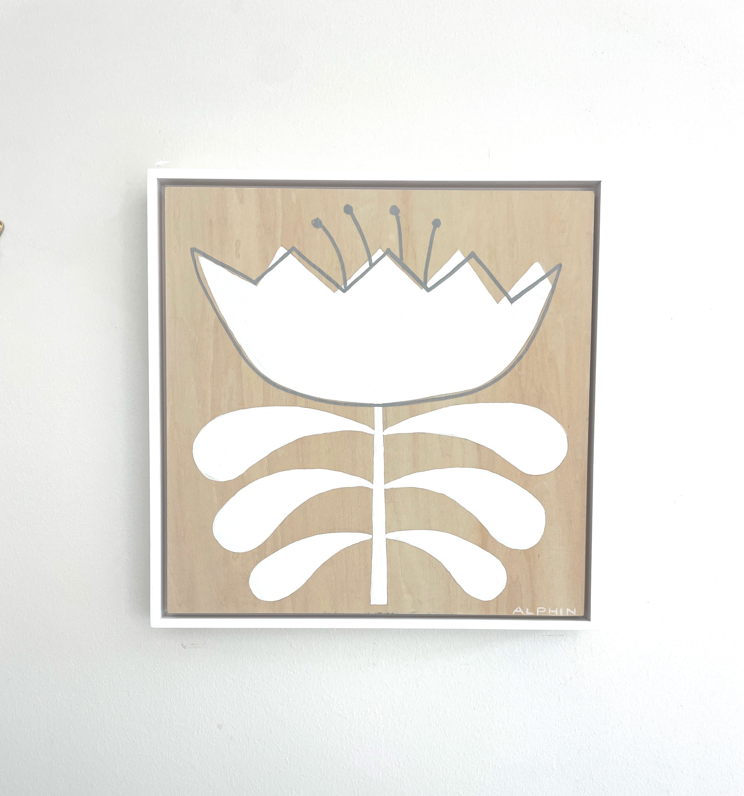 acrylic and posca pen on wood panel, in white floater frame