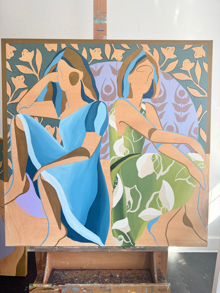 My name is Lizzy Love and I'm an artist in Nashville, TN. I create figurative works on canvas with acrylic paint and papers with watercolor and gouache. This body of work has been a rebirth for me creatively. While I've been painting full time for the last 5 years, I feel like I've really come into myself creatively with my figurative paintings. Born out of a time of uncertainty and lots of questioning, I was pushed to dig deep and get back to basics. I decided to switch gears from painting the landscapes, for which I had been primarily making for years. As an effort to get my creative spark back, I started sketching figures from magazines, a subject I hadn’t explored in a long time. Over many months they slowly evolved into what they have become; starting from detailed and realistic, to more abstract and modernist. I am a big believer that the environment of your home shapes your attitude, and for that reason I love interior design. That love is what led me to start incorporating furniture / interior surroundings / and patterns into the pieces. I pull apart and put back together the lines and shapes of many of my favorite interiors, and place them amongst the figures in a dynamic way. These ladies embody many things - community, respect, femininity, reverence. They are a way to draw attention to what being a woman entails. Many times it means being fierce and strong. Many times it means leaning on and drawing your strength from friends that are like family. While creating each piece, I draw upon the love and reverence I have for all the women in my life; the women who have shaped me, lifted me up when I needed it, laughed with me, and inspired me.