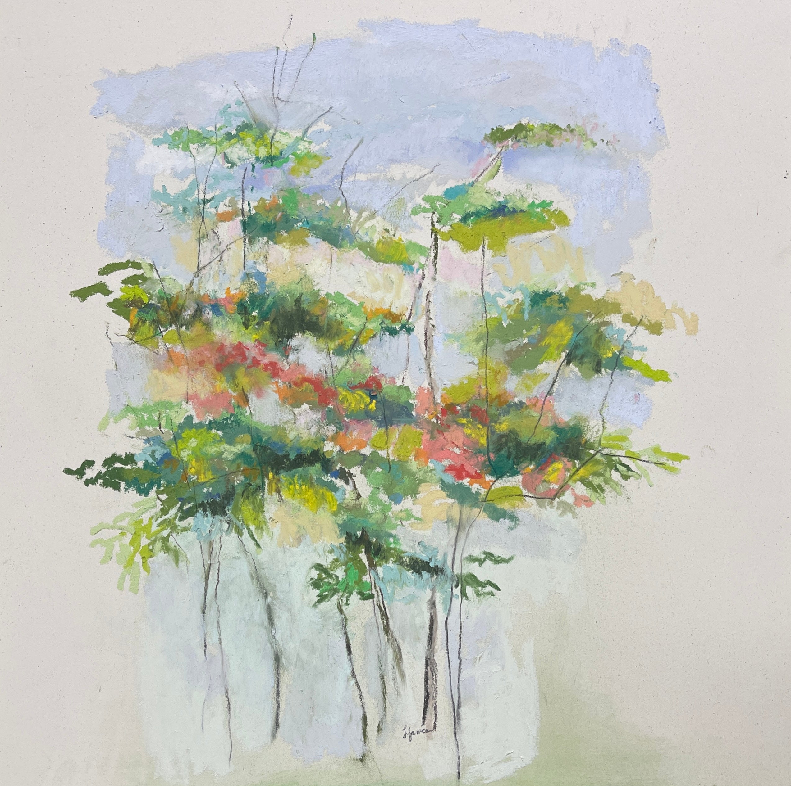 Linda James grew up in Rome, Georgia as the oldest of 5 children. Linda loved to draw from a young age. Her parents always encouraged her artistic endeavors and framed much of her college work to hang in their home. She believes that people are created with the interest, and encouragement takes us onward, which is exactly what her parents did for her. Linda is most known for her ethereal award-winning Angels and has done a number of landscapes over the years - the greens and browns and blues are always layered and lovely. However, for this new body of work, she "wanted another dimension - a twist maybe, so is working in colors unusual for landscapes and lines instead of shapes - all of which is stimulating and thought provoking - and, with the soft pastels they take on an abstraction that feels exciting." Through her work, Linda aims to share God's word in a way that touches others and perhaps awakens a desire to know Him better.